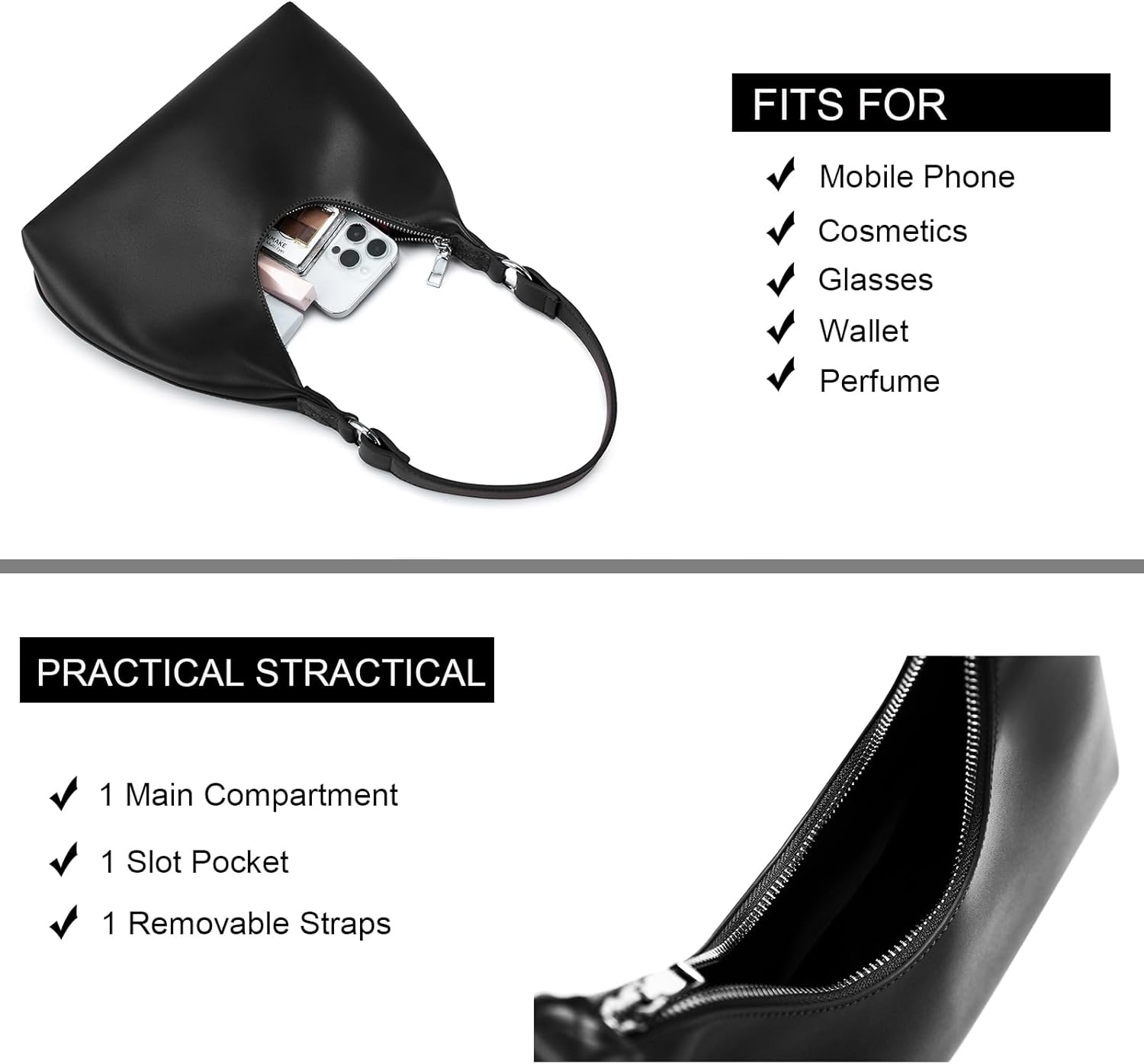 1 Main Compartment, 1 Interior Zipper Pocket. It can organize Phone, wallet, power bank, glasses, lipstick etc. Suitable for any clothing, dress, office, activities, party, shopping, dating and other occasions.