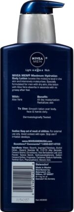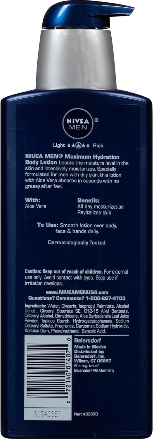 Includes one (1) 16.9 fluid ounce bottle of NIVEA MEN Maximum Hydration Nourishing Body Lotion
