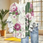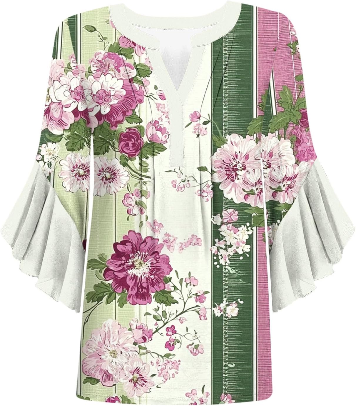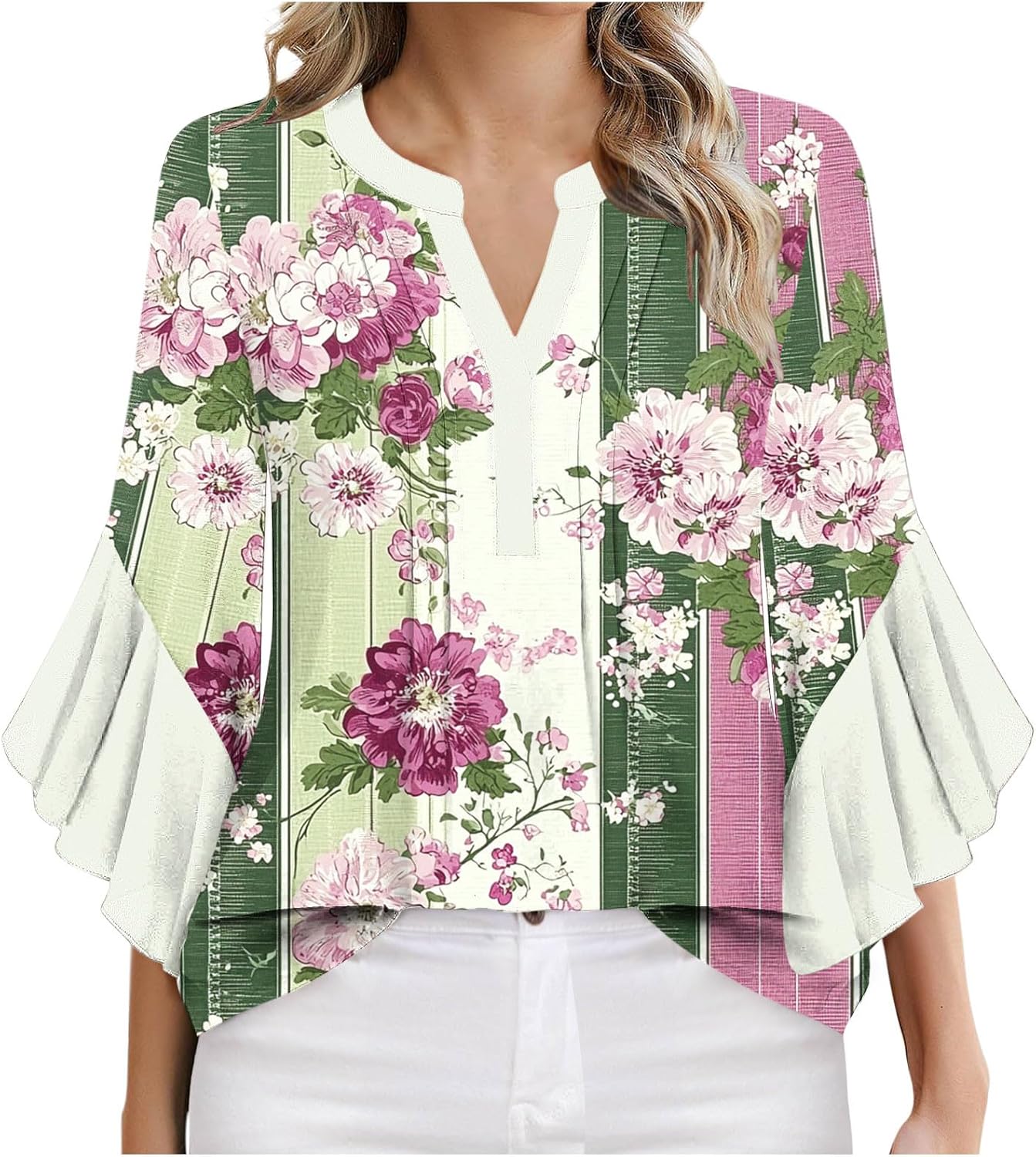 NSICBMNO Womens Summer Tops V Neck Tshirt Boho Floral Top Ruffle Blouses 3/4 Sleeve Tops Tunic Shirt Baggy T Shirts Oversized T Shirts Casual Blouses Floaty Tshirt for Holiday Beach Work