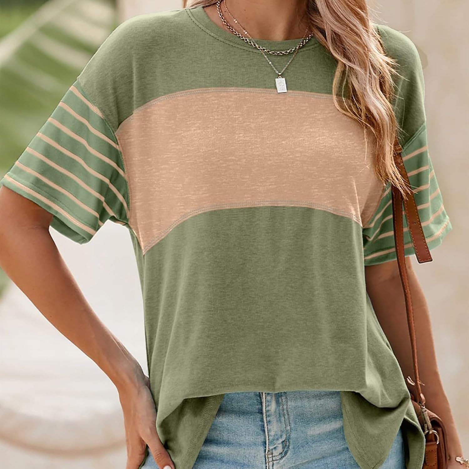 NSICBMNO Womens Tunic Tops UK Oversized T Shirts Short Sleeve Blouses Striped T Shirt Colour Block Tshirt Long Shirts Round Neck Tshirts Baseball Tshirts Loose Blouses Aesthetic Streetwear