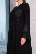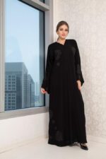 This elegant dress is crafted from high-quality fabric, showcases exquisite work that enhances its luxurious appeal. Designed for both comfort and style making it a perfect choice for any occasion. The model confidently points, highlighting the versatility and sophistication of this timeless garment.