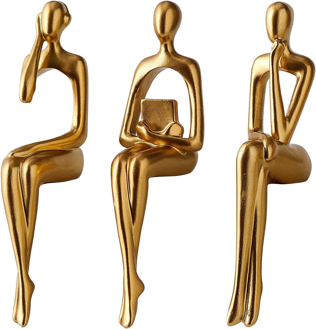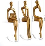 A set of 3 elegant abstract figure sculptures, handmade in resin with smooth surface, easy to clean, environmentally friendly and healthy, with modern and artistic style. Each of these golden abstract figures is distinctive and contains three different interesting poses (the thinker holding his chin as if thinking about a problem, the listener with headphones and one hand in his ear, the reader clutching a book and looking away,) they all sit quietly and seem to be thinking about the past present and future. The golden figure statue adds the perfect touch to any room in your home