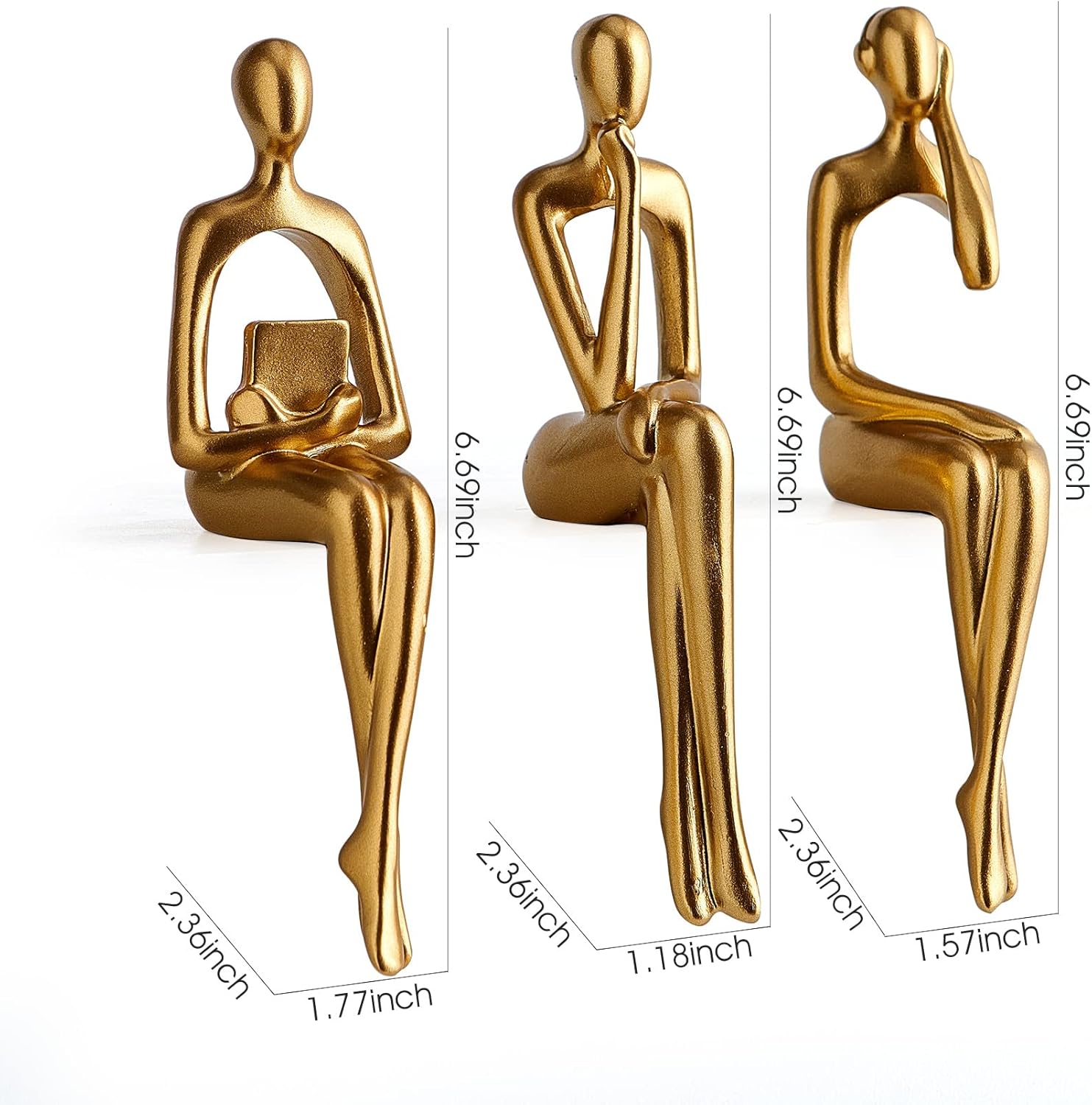 The Listening Sculpture measures 1.57*2.36*6.69 inches, the Reading Statue measures 1.77*2.36*6.69 inches, and the Thinker measures 1.57*2.36*6.69 inches, these golden figure statues are the perfect decoration for your bookshelf, mantle, table, desk, display shelf, and TV stand