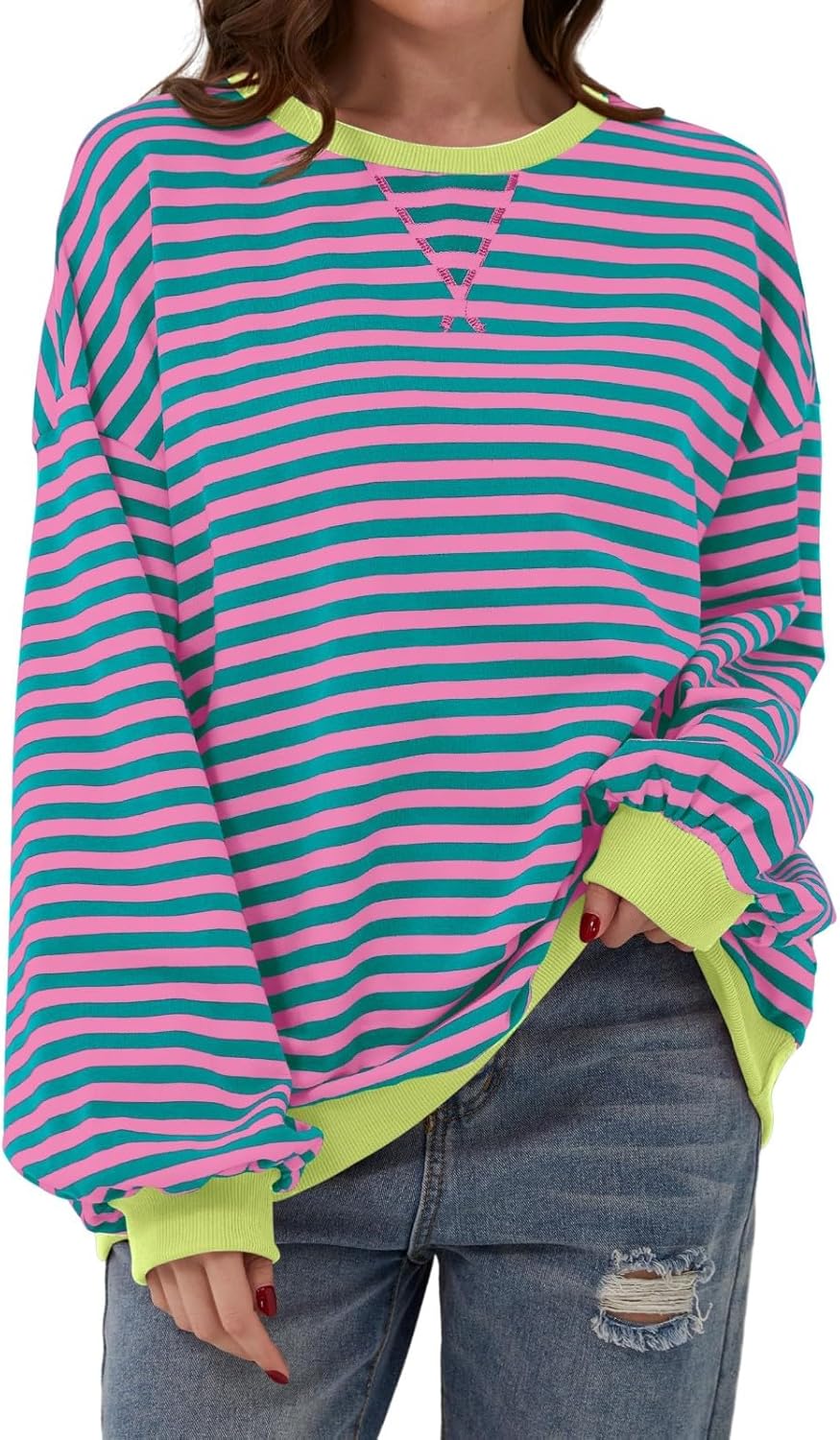 OIOLOYJM Oversized Sweatshirt for Women Striped Long Sleeve Shirts Crew Necks Sweatshirts Color Block Y2k Tops for Womens
