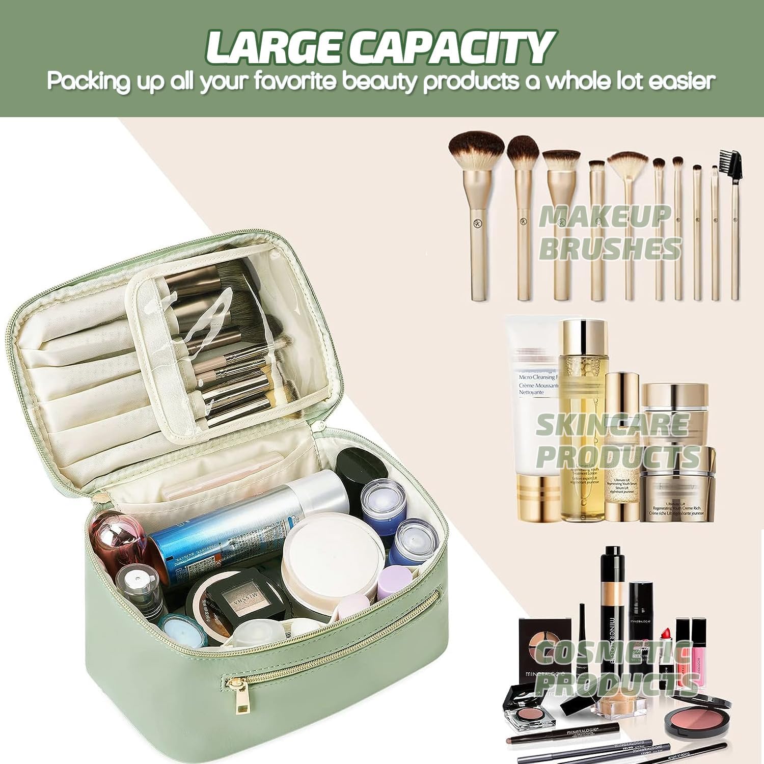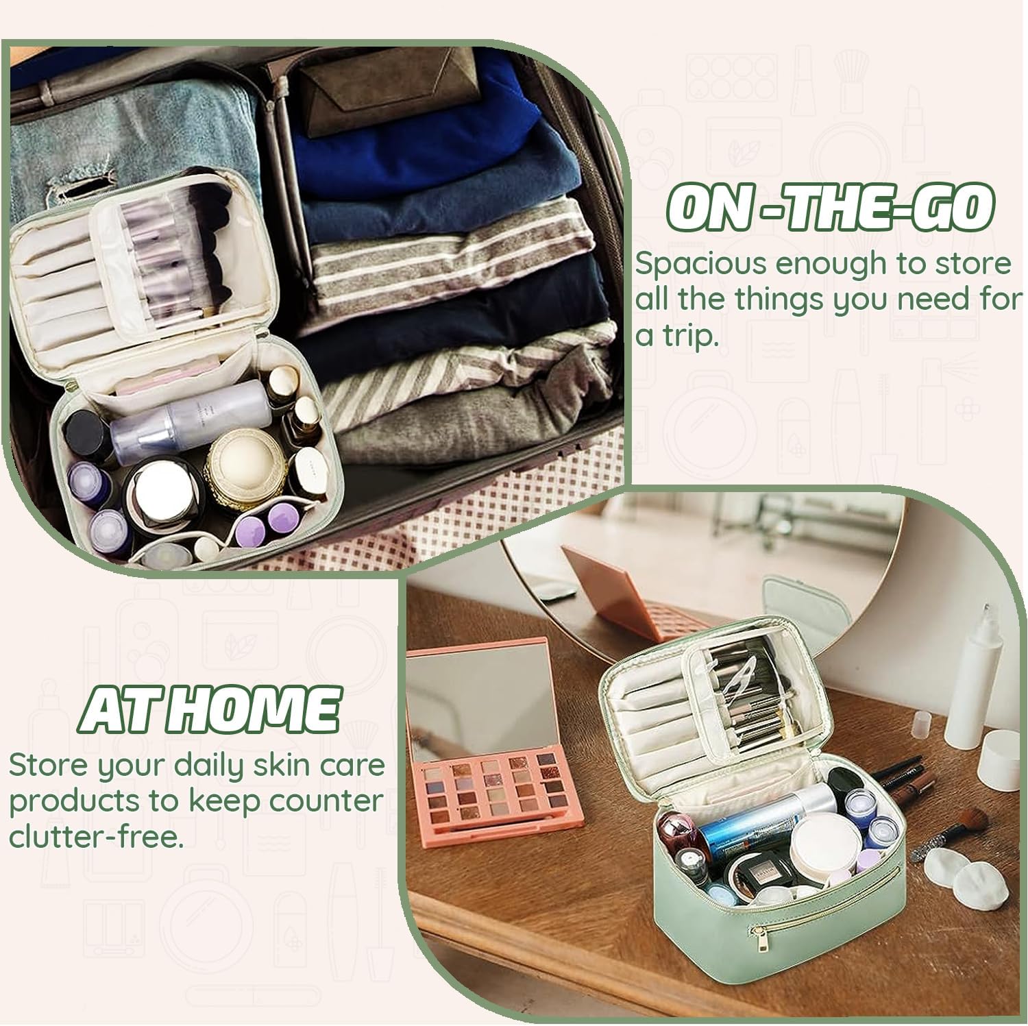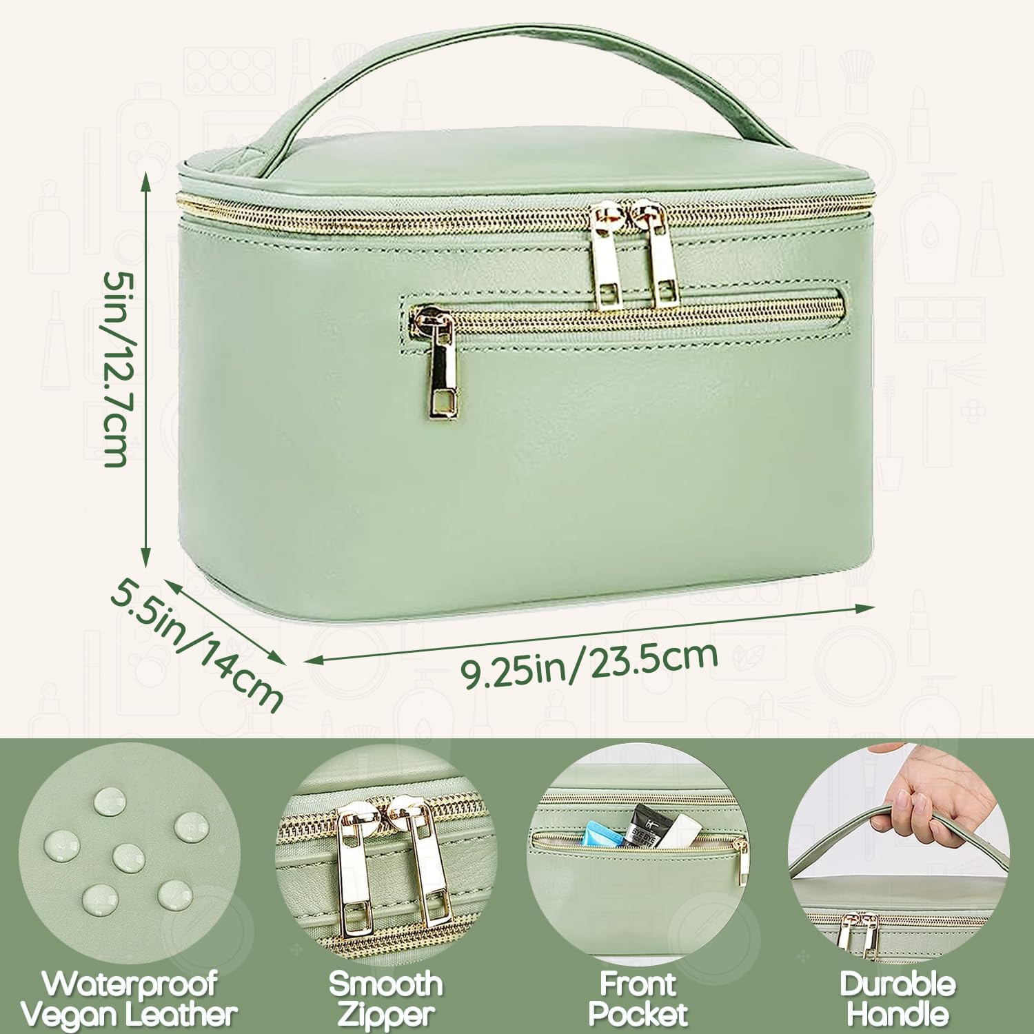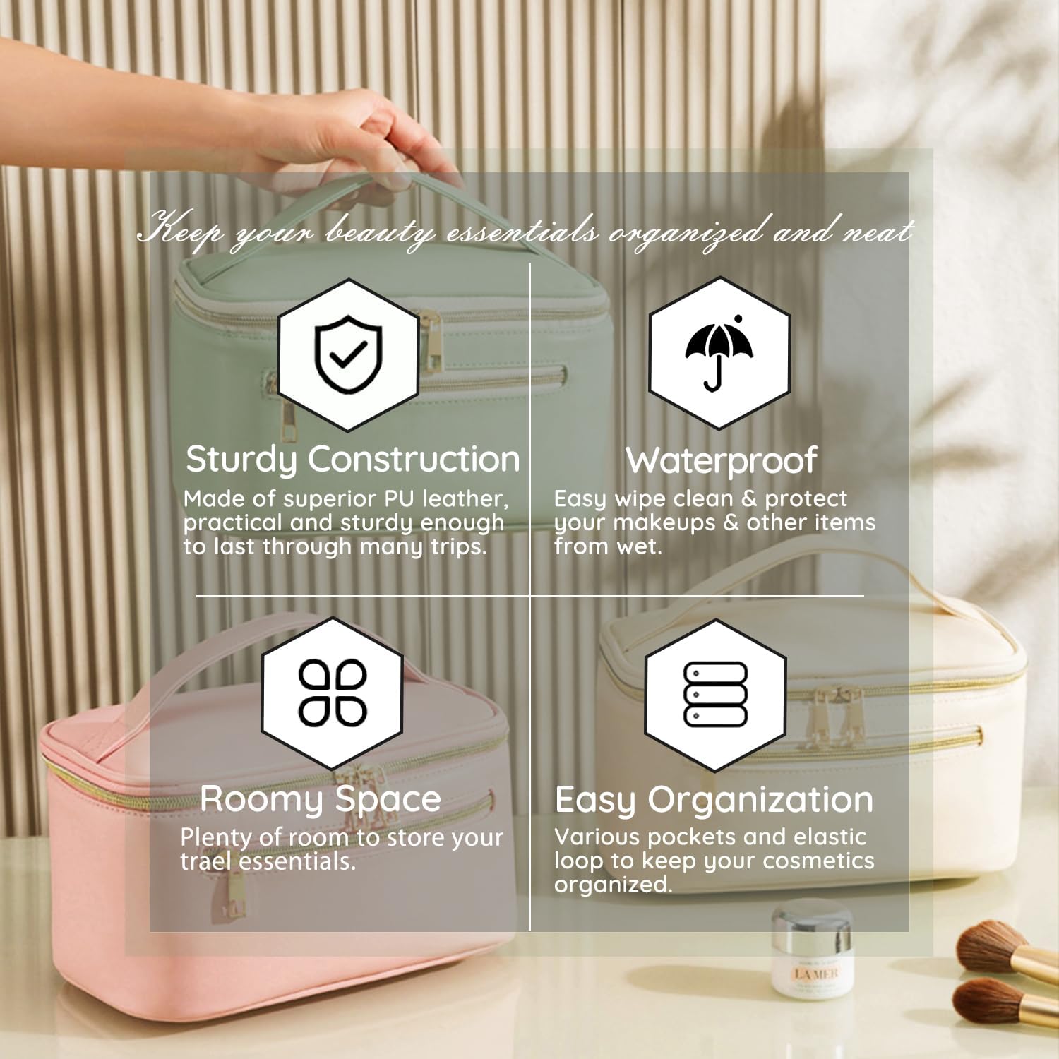 𝑷𝒓𝒆𝒎𝒊𝒖𝒎 𝑫𝒖𝒓𝒂𝒃𝒊𝒍𝒊𝒕𝒚 & 𝑨𝒍𝒍-𝑹𝒐𝒖𝒏𝒅 𝑷𝒓𝒐𝒕𝒆𝒄𝒕𝒊𝒐𝒏 – Made of high-quality vegan leather (soft touch, anti-scratch) with smooth metal zippers (anti-rust, long-lasting). Its water-resistant and stain-resistant features shield cosmetics, brushes, and skincare from spills, moisture, and dust—no more ruined products!