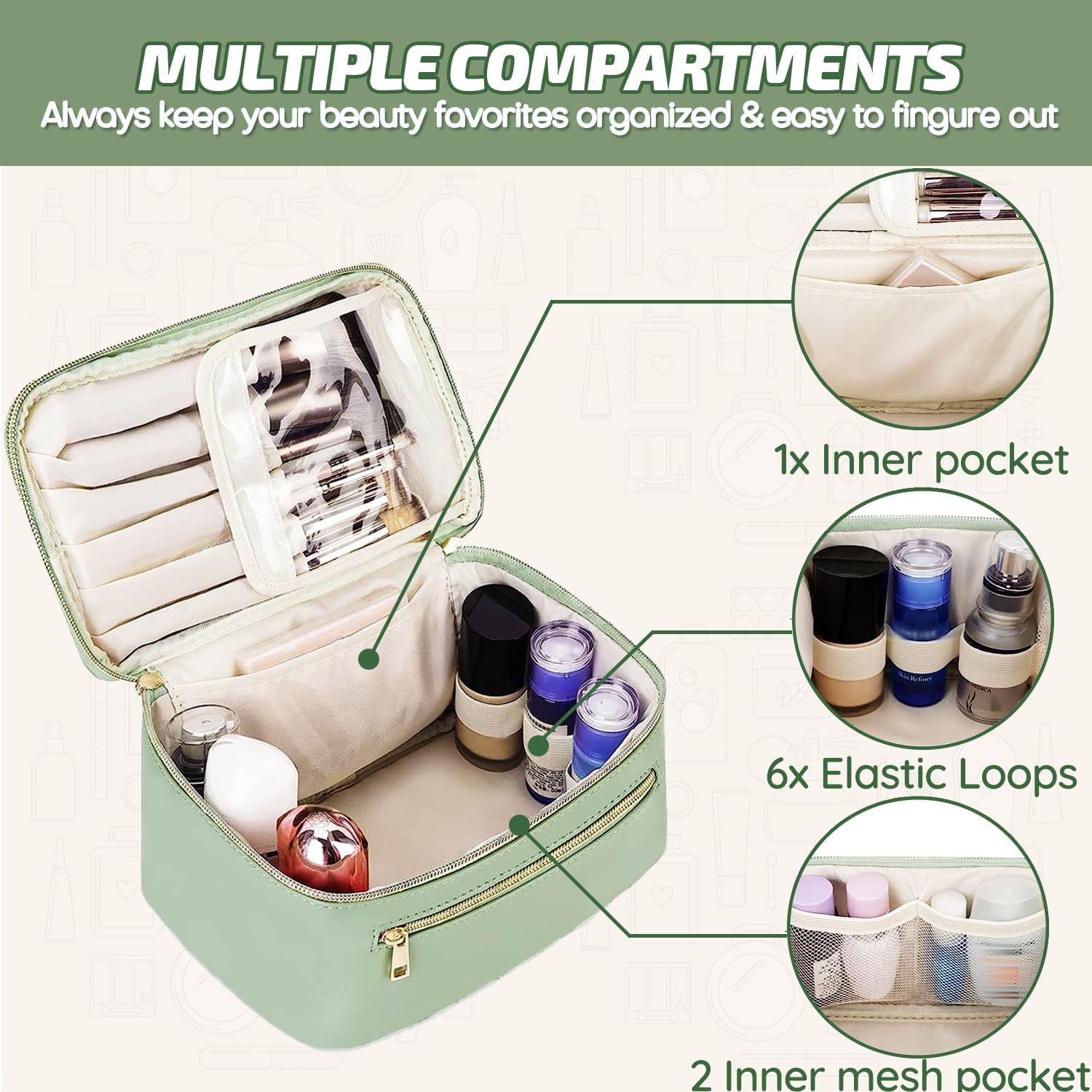 𝑲𝒆𝒆𝒑 𝒀𝒐𝒖𝒓 𝑬𝒔𝒔𝒆𝒏𝒕𝒊𝒂𝒍𝒔 𝑰𝒏 𝑷𝒍𝒂𝒄𝒆 – With a inside compartment and 2 mesh pockets to store various cosmetic or skincare products, plus several band loops to hold liquids upright, a place to put brushes with a cover, and a front zipper pocket. Always keep your beauty favorites organized and easy to fingure out.