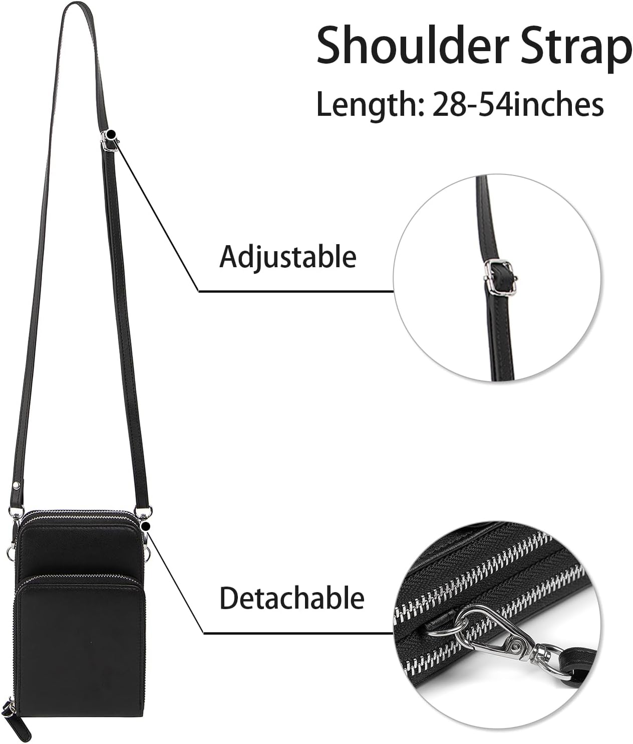 Outer Material: Faux Leather Strap type: Adjustable Color: Black Material: Faux Leather.