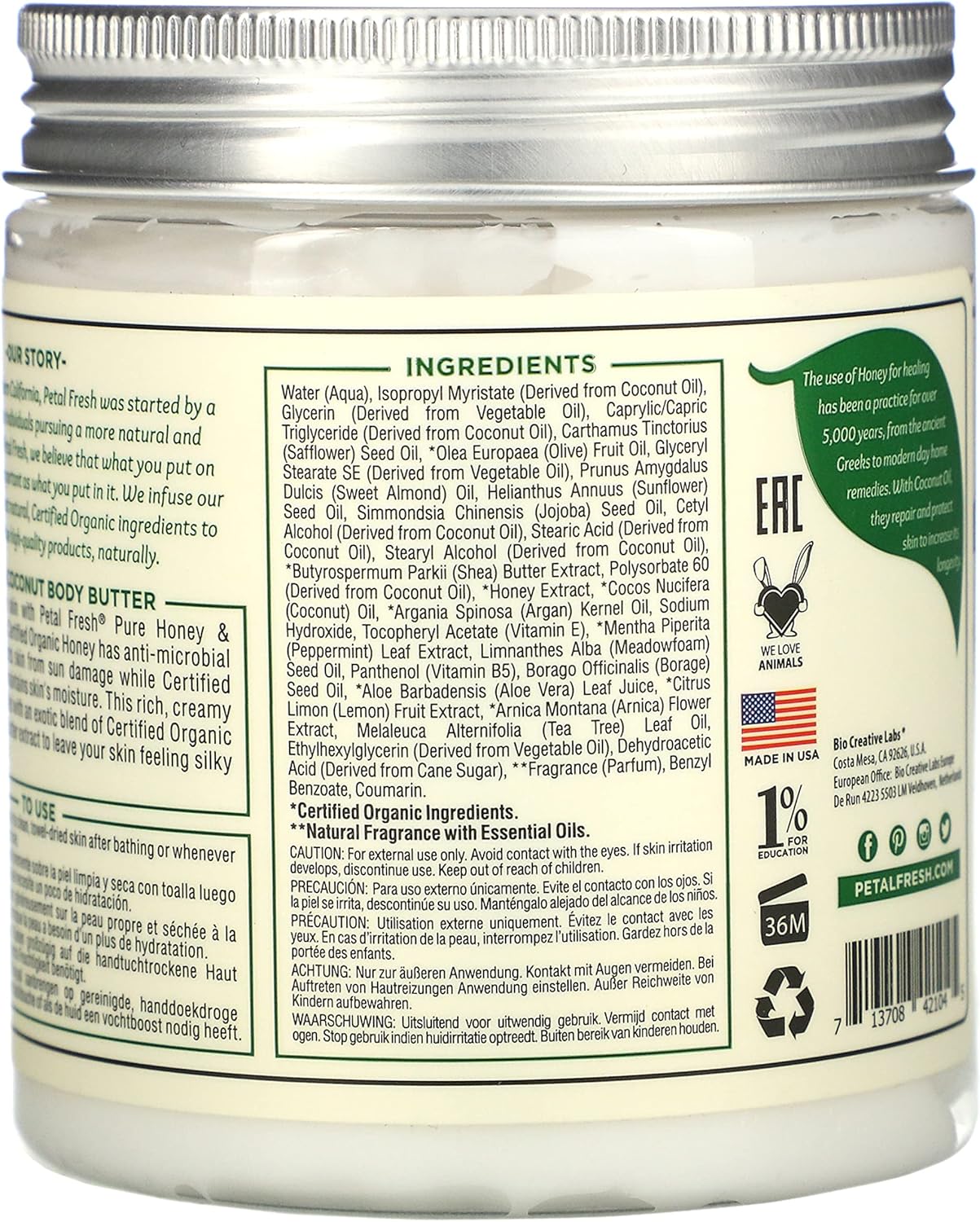 Petal Fresh Restoring Honey & Coconut Oil Body Butter | With Coconut, Shea & Honey | For Silky smooth Skin Touch – Intense Hydration | Vegan & Cruelty Free | 8 oz, 237 Ml