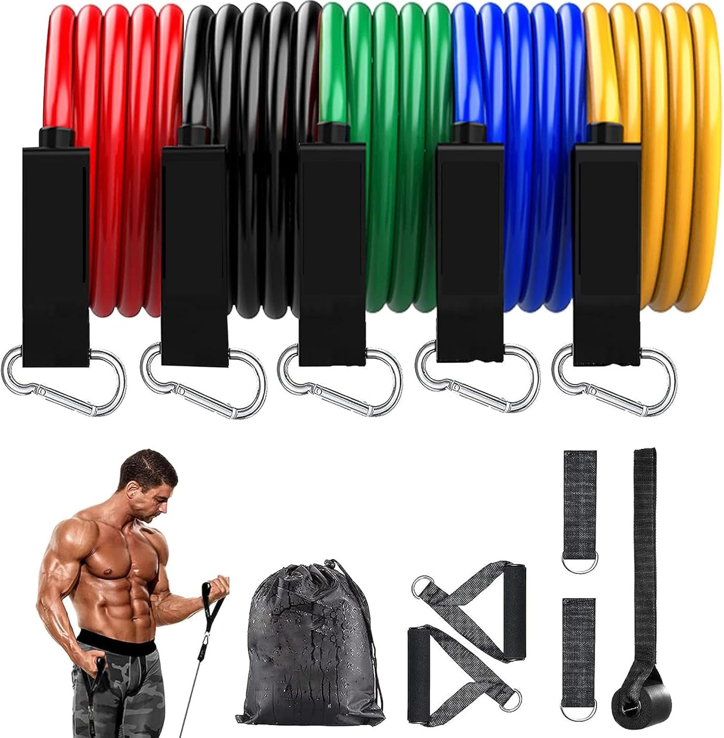 Accessories: 2 Legs Ankle Straps, 1 Door Anchor, 2 Soft Handles, 1 Bag, 5 color professional resistant bands.