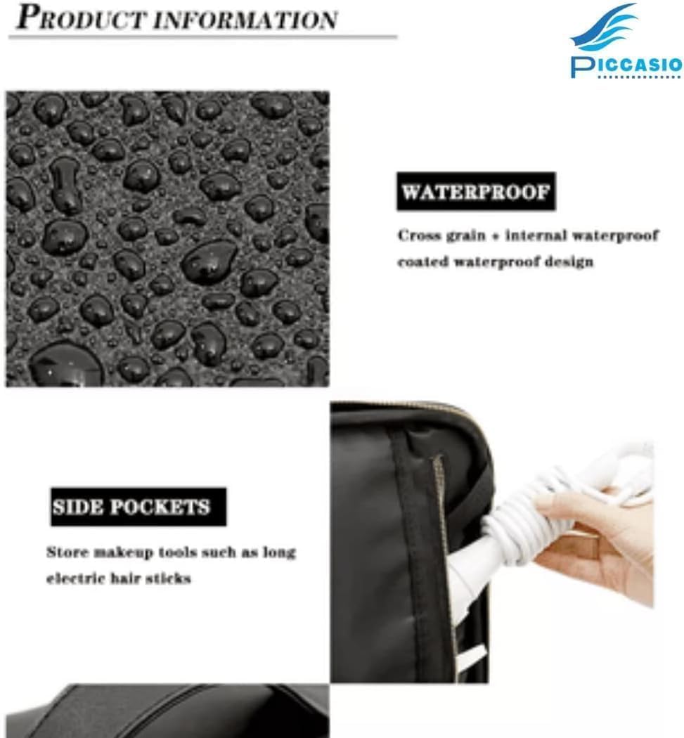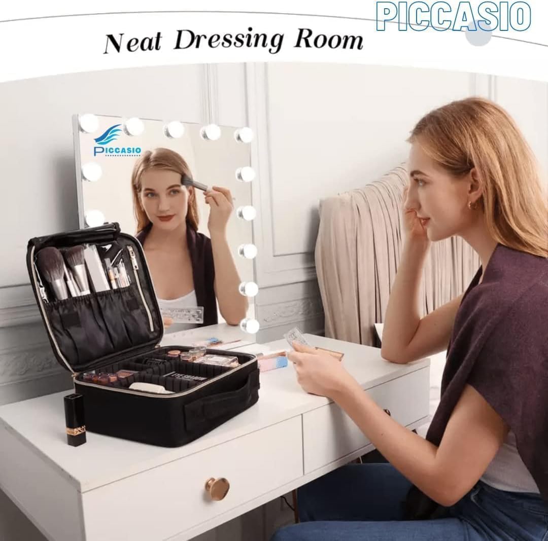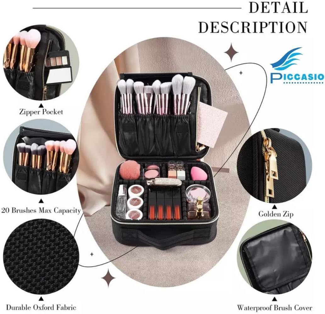 PICCASIO™ Travel Makeup Bag for Women – Waterproof Toiletry Organizer with Brush Slots, Dividers & Carry Handle – Portable Cosmetic Train Case for Girls & Beauty Essentials