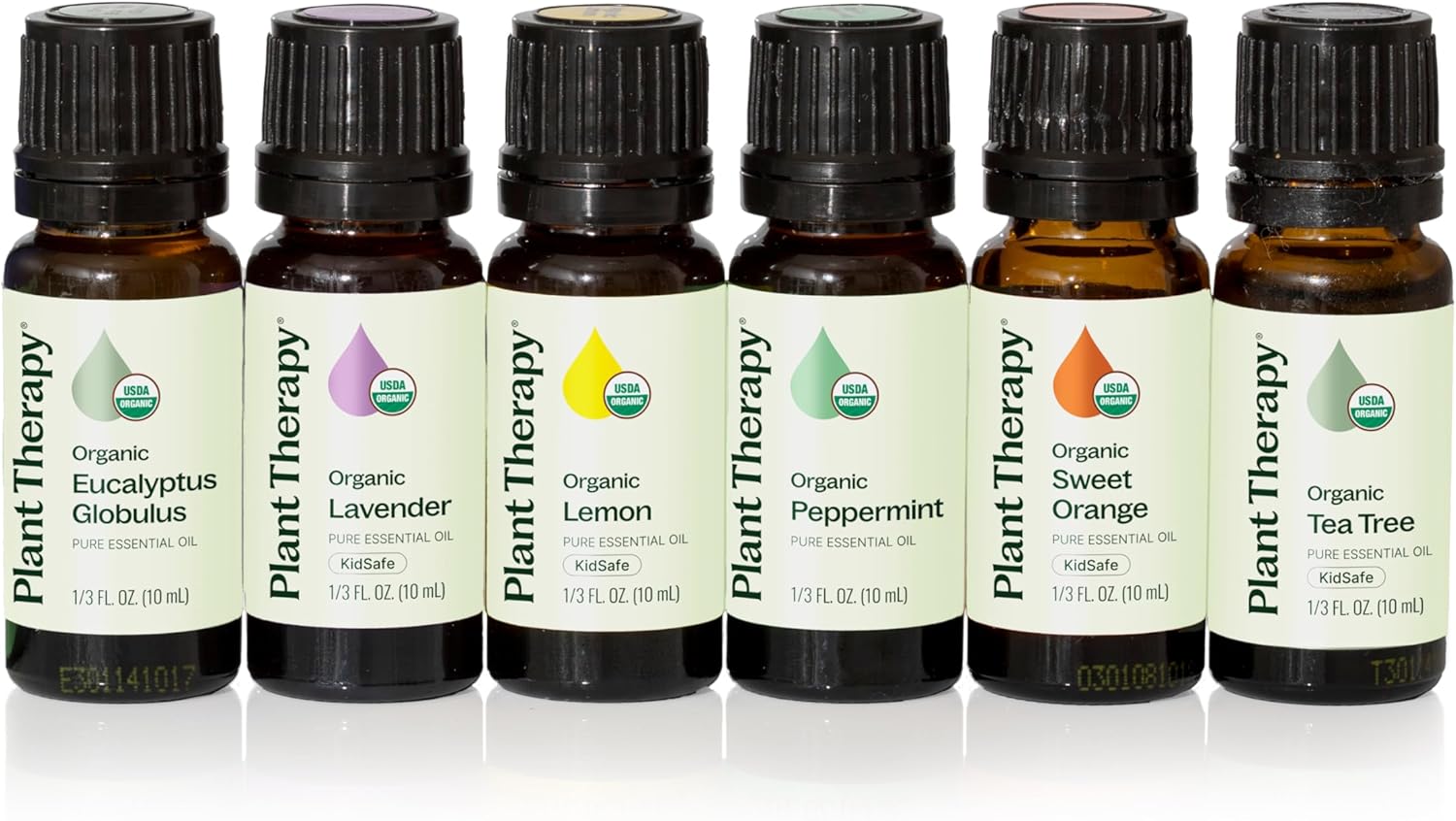 Plant Therapy Top 6 USDA Certified Organic Essential Oils Set. Includes: Eucalyptus, Lavender, Orange, Peppermint, Lemon and Tea Tree. 10mL (1/3 Ounce) each.