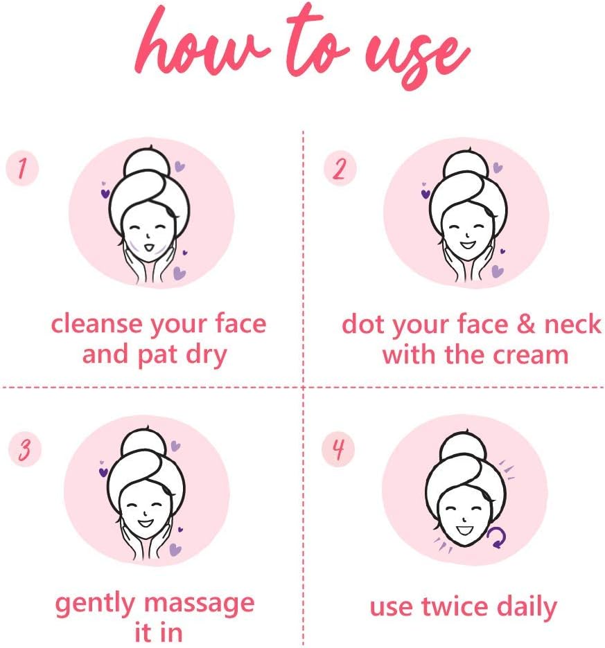 How to Use: Apply day and night after cleansing. Dot the cream on forehead, cheeks, nose, and chin, then gently massage in upward-outward circles, including the neck area. Reapply after 8-10 hours or as needed. Safe to apply SPF over it.