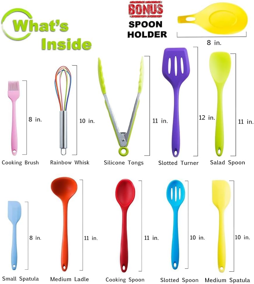 PREMIUM SET: 12-piece silicone kitchen utensil set featuring spatulas, spoons, whisk, and tongs, complete with a convenient storage holder