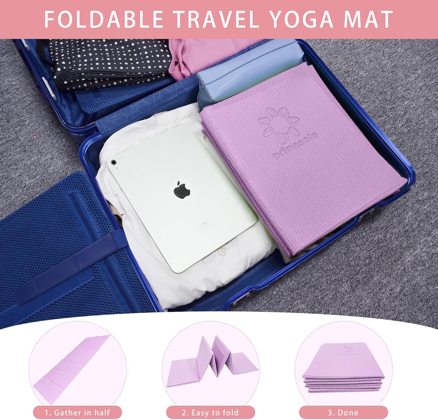 【GREAT FOR TRAVEL, PARK, BEACH】 Yoga Mat folds up nicely, Fit in Back-pack, Suitcase, Tote bag. After yoga class or gym, fit in your bag and go to shopping, lunch and class at campus. Ideal size for travel, school, park, and beach.