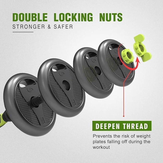 🔒【Double Locking Nuts for Safety】 Features a unique double-locking nut system to prevent weight plates from falling off during workouts, giving you more stability and confidence during heavy lifts.