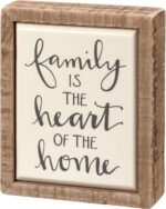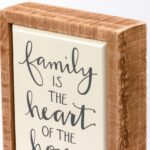 A wooden box sign mini featuring a hand lettered “Family Is The Heart Of The Home” sentiment and tile-like enamel finish for added appeal. Easy to hang or can free-stand alone.