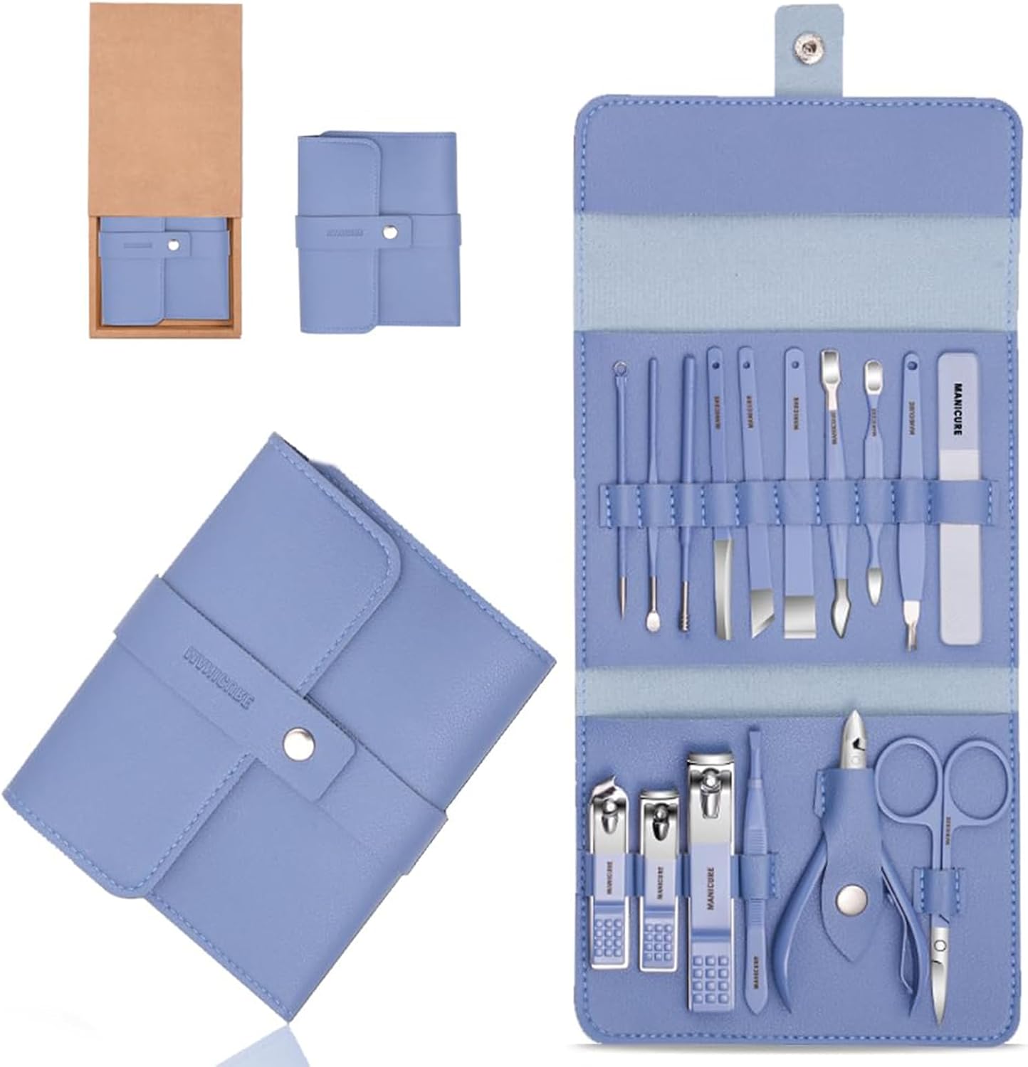 Professional Manicure Set – 16-Piece Stainless Steel Nail Clipper & Pedicure Kit, Nail Care Grooming Tools with Portable Travel Leather Case for Men and Women (Blue)