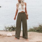Qgaomye Women Linen Palazzo Pants Summer Wide Leg Elastic High Waist Lounge Pant with Pockets Boho Beach Vacation Outfits