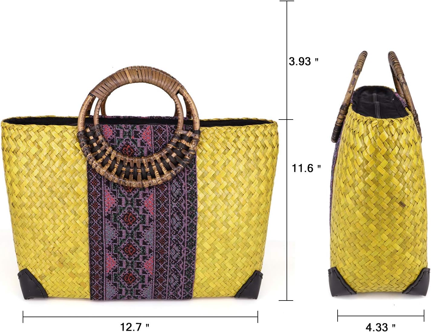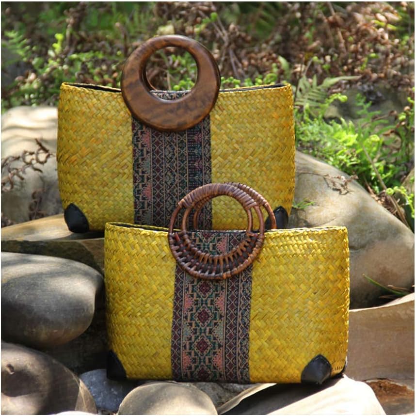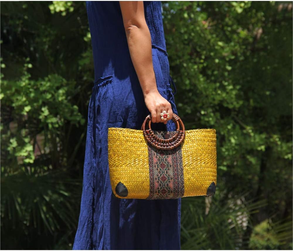 QTKJ Women Summer Retro Straw Bag with Printing Hand-woven Beach Handbag Top Round Handle Boho Tote Bag Shopping and Travel Large Bag (Yellow), Yellow, 14.1”x 3.9”x 7.8”