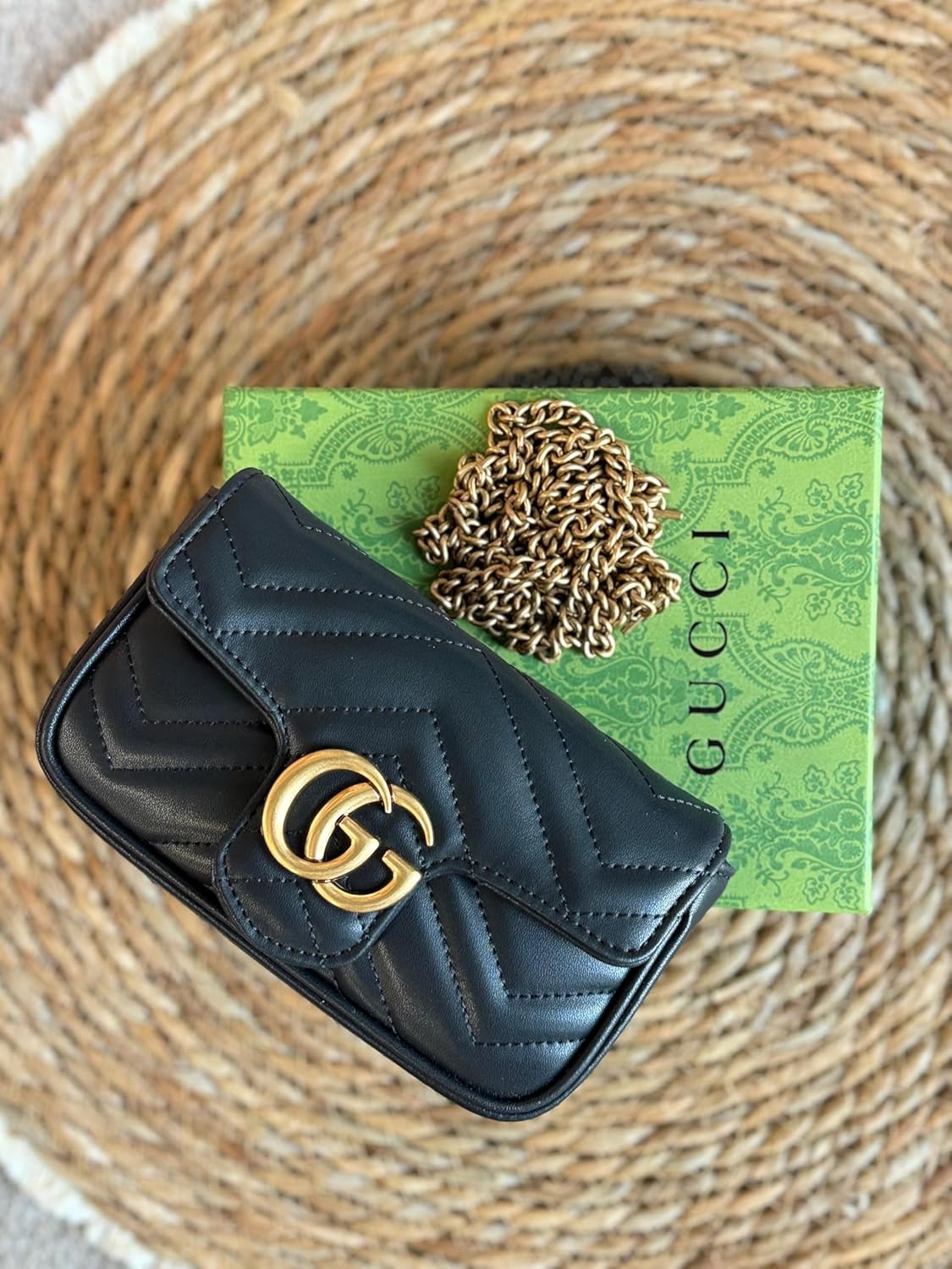 Elevate your accessory collection with this exquisite super mini shoulder bag. Crafted from premium black leather, this sophisticated piece features distinctive chevron quilting and an iconic double G gold-tone hardware closure. The meticulous stitching detail creates a luxurious chevron pattern across the supple leather exterior. Perfect for carrying your essential items, this compact bag measures approximately 11 cm in height and 17 cm in width. The sleek design is complemented by clean lines and precise craftsmanship, making it an ideal choice for both evening events and daytime occasions. The timeless black colour and classic quilted pattern ensure this bag will remain a treasured wardrobe staple for years to come. The structured silhouette maintains its shape while protecting your belongings in style.