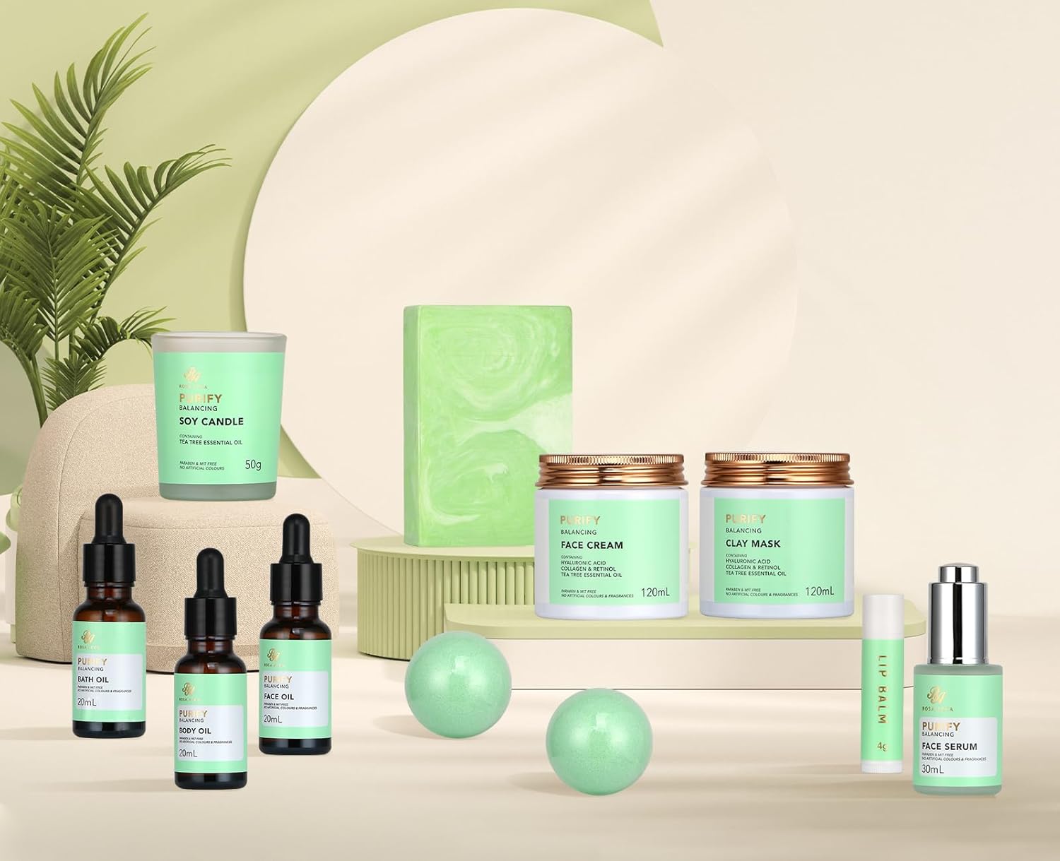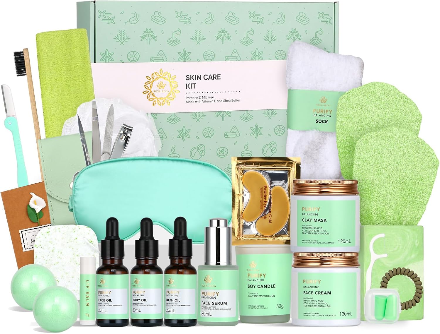 The Spa Gift Set includes: 120 ml Clay Mask 120 ml Face Cream 30 ml Face Serum 20 ml Face Oil 20 ml Body Oil 20 ml Bath Oil 100 g Handmade Soap 2*50 g Bath Bomb 50 g Soy Candle 4 g Lip Balm 1* Potpourri Gift Card 1* Spa Head Band, Bamboo Toothbrush, Eyebrow Razor, Hair Tie, Dental Floss 1* Manicure Set (4Piece), Face Sponge, Shower Puff, Silk Sleep Eye Mask 1 pair of Collagen Gold Eye Mask, Exfoliating Bath Glove, Fuzzy Soak, Earplugs