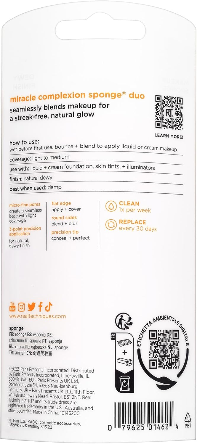 The Real Techniques Miracle Complexion Sponge flawlessly blends liquid and cream products with ease for a streak-free, luminous glow. Our best-selling makeup blending sponge offers a natural, dewy finish, and its micro-fine pores help create a seamless base with light to medium coverage. Real Technique’s makeup sponge works best with liquid and cream makeup products such as foundation, skin tints, and illuminators. This makeup sponge has RT’s unique 3-point application technique that makes blending products seamless. First use the flat edge of the makeup blender sponge to pack on product, then the precision tip to conceal, and finally, blend it all out with the rounded side. Use it damp for extra dewiness and let that inner glow shine through. The Miracle Complexion Sponge is easy to clean using our Real Techniques Brush + Sponge Cleansing Gel. It’s also 100% cruelty-free, vegan, and designed with revolutionary latex-free foam technology. We are Real Techniques, the brand of choice for all makeup users, no matter your level of expertise. Created in collaboration with leading makeup artists, we aspire to take the mystery out of choosing beauty tools so you can focus more time on putting your best face forward one blend at a time. From full makeup looks, to quick beauty hacks, RT brushes + sponges are exceptionally high quality for professional looking results every time. BUT… don’t be fooled by our affordable prices, RT tools are award-winning + purposefully designed because that’s what you deserve. Quality without compromise.