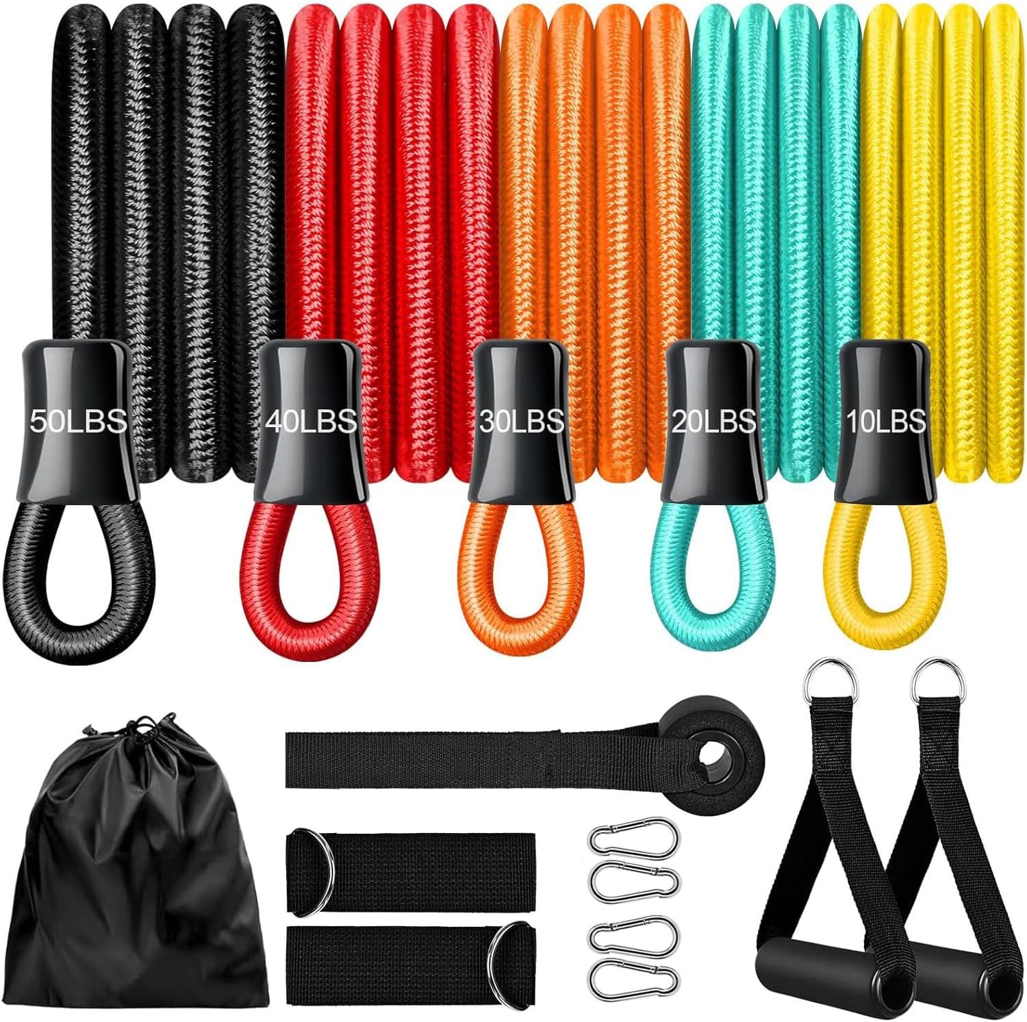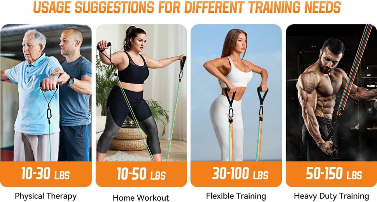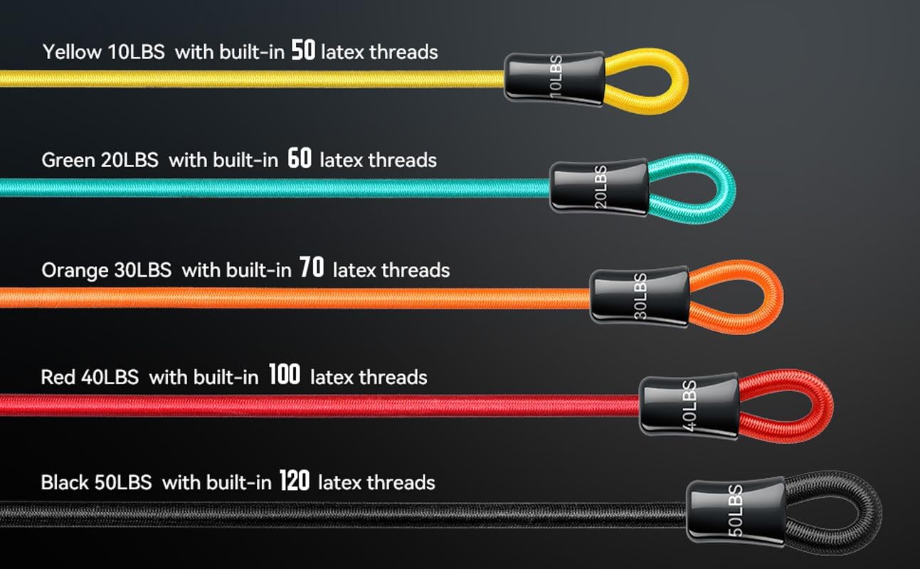 Adjustable Resistance Levels: Combine bands to create the perfect resistance for any exercise. Each band is color-coded and labeled with resistance levels ranging from 10 to 50 lbs