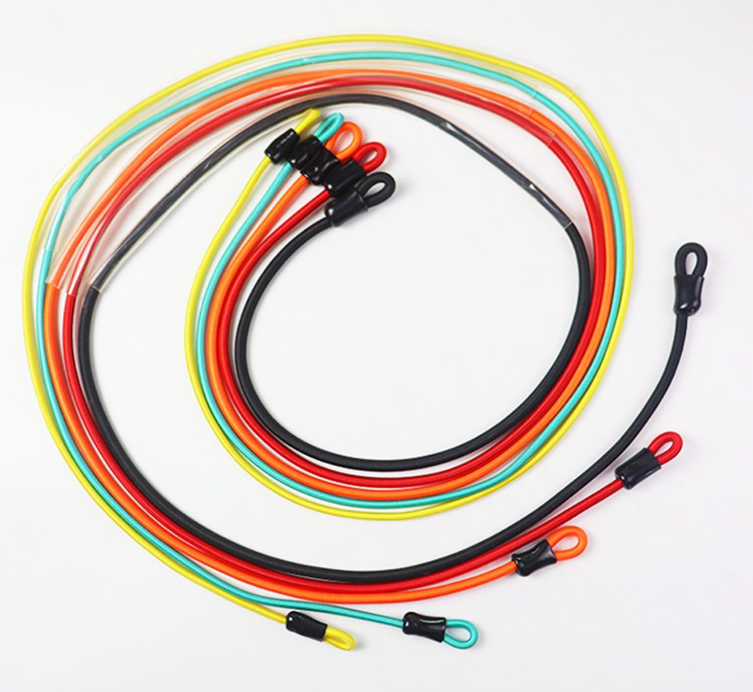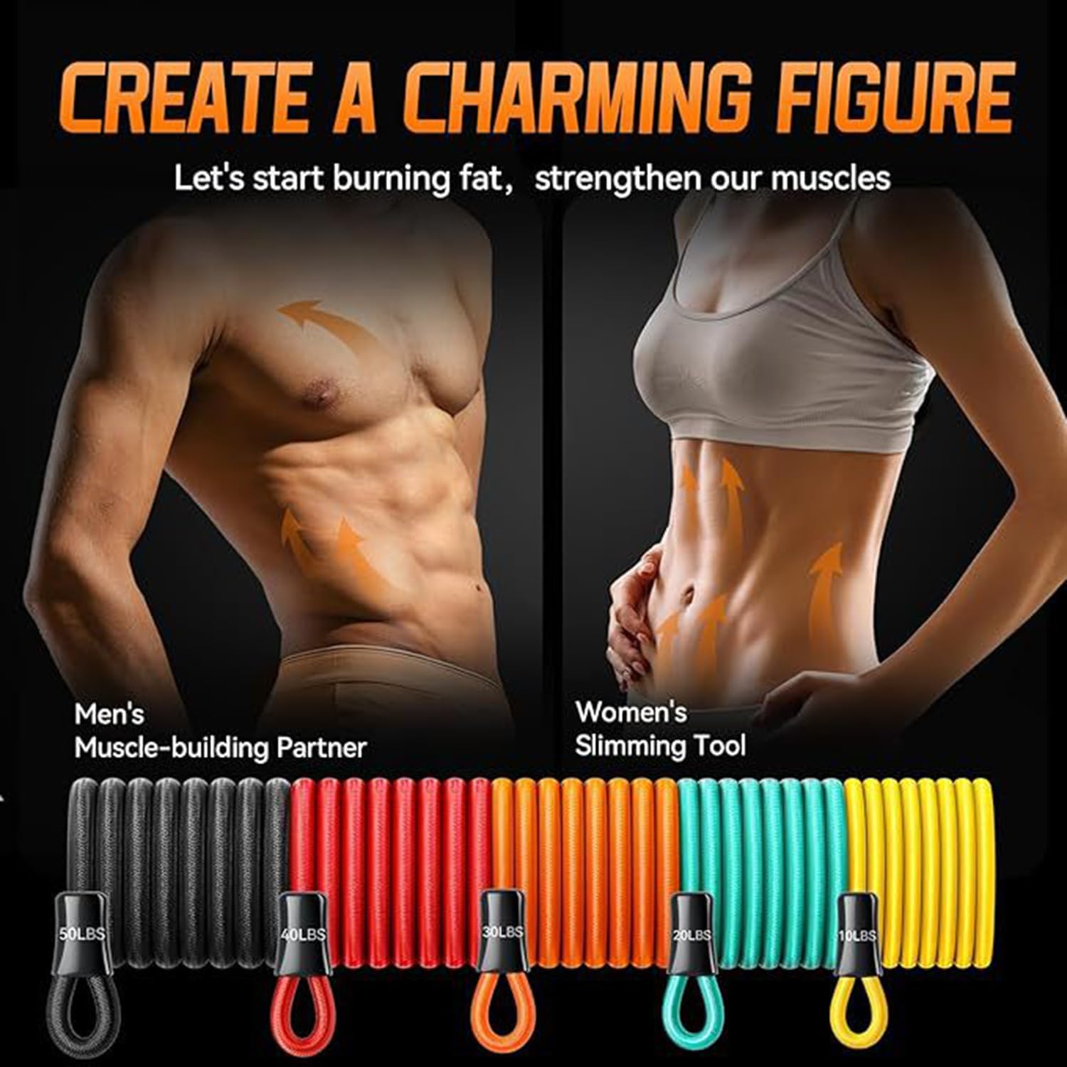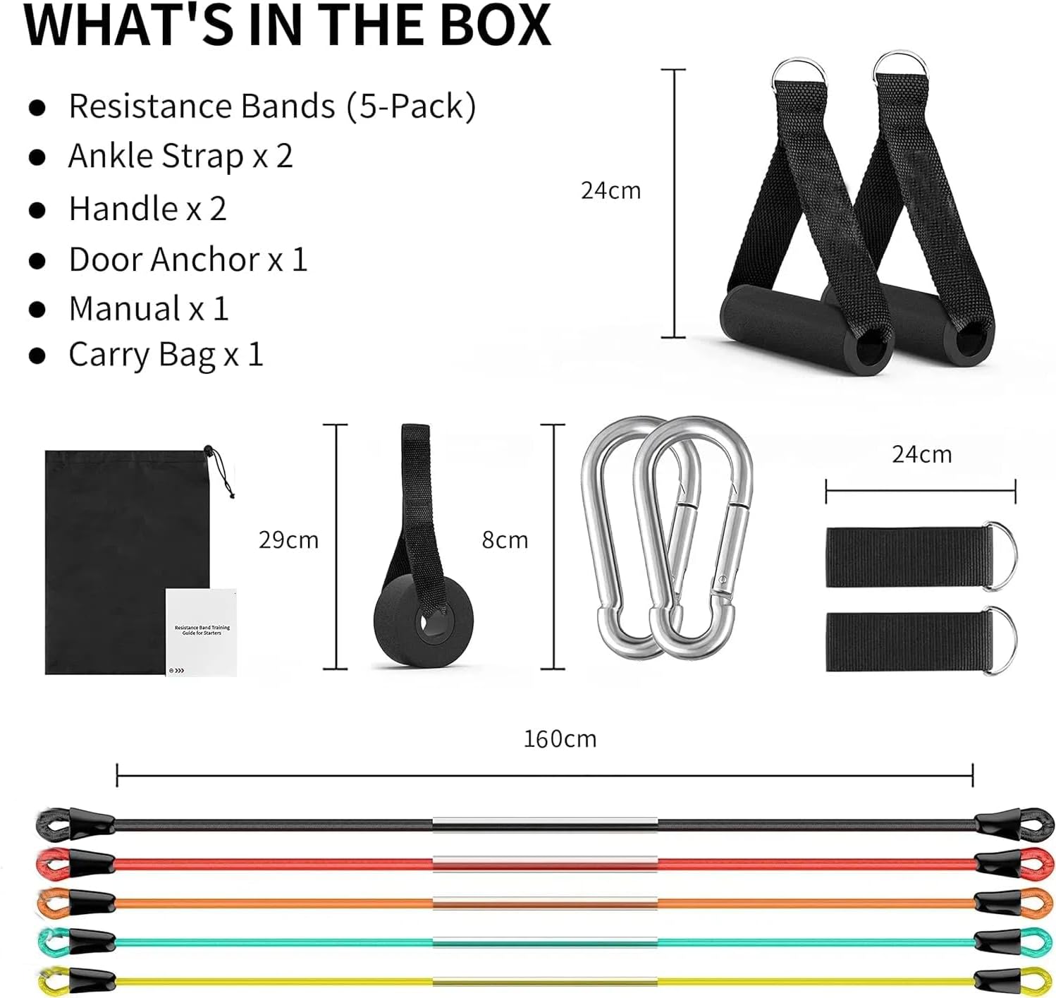 Pick up our resistance bands to wake up your muscles . Packing List: 5 * Tube Resistance Bands — Yellow (10 lbs),Green (20 lbs), Orange (30 lbs),Red (40 lbs), Black(50 lbs) 2 x Handles 2 x Ankle Straps 2 x Carabiner 1 x Door Anchor 1 x Storage Bag 1 x User Manual Life Time Service
