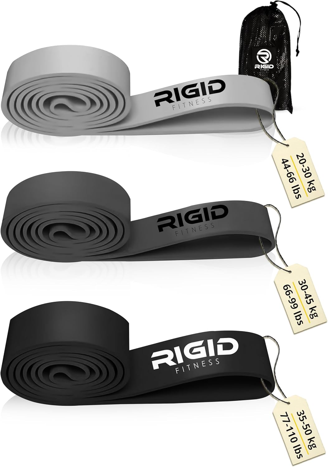 Kickstart your fitness journey with RIGID FITNESS’s Professional Pull-Up Assistance Bands, ideal for both beginners and seasoned trainers.These versatile bands, available in three distinct resistance levels, are perfect for a wide range of exercises, including Yoga, Pilates, CrossFit, and more.They assist in pull-ups, stretching, dips, and pushups, targeting the upper body, legs, abdominals, back, and arms.Showcased in three vibrant colors, each band is demonstrated by a model performing different exercises, exemplifying their multifaceted use