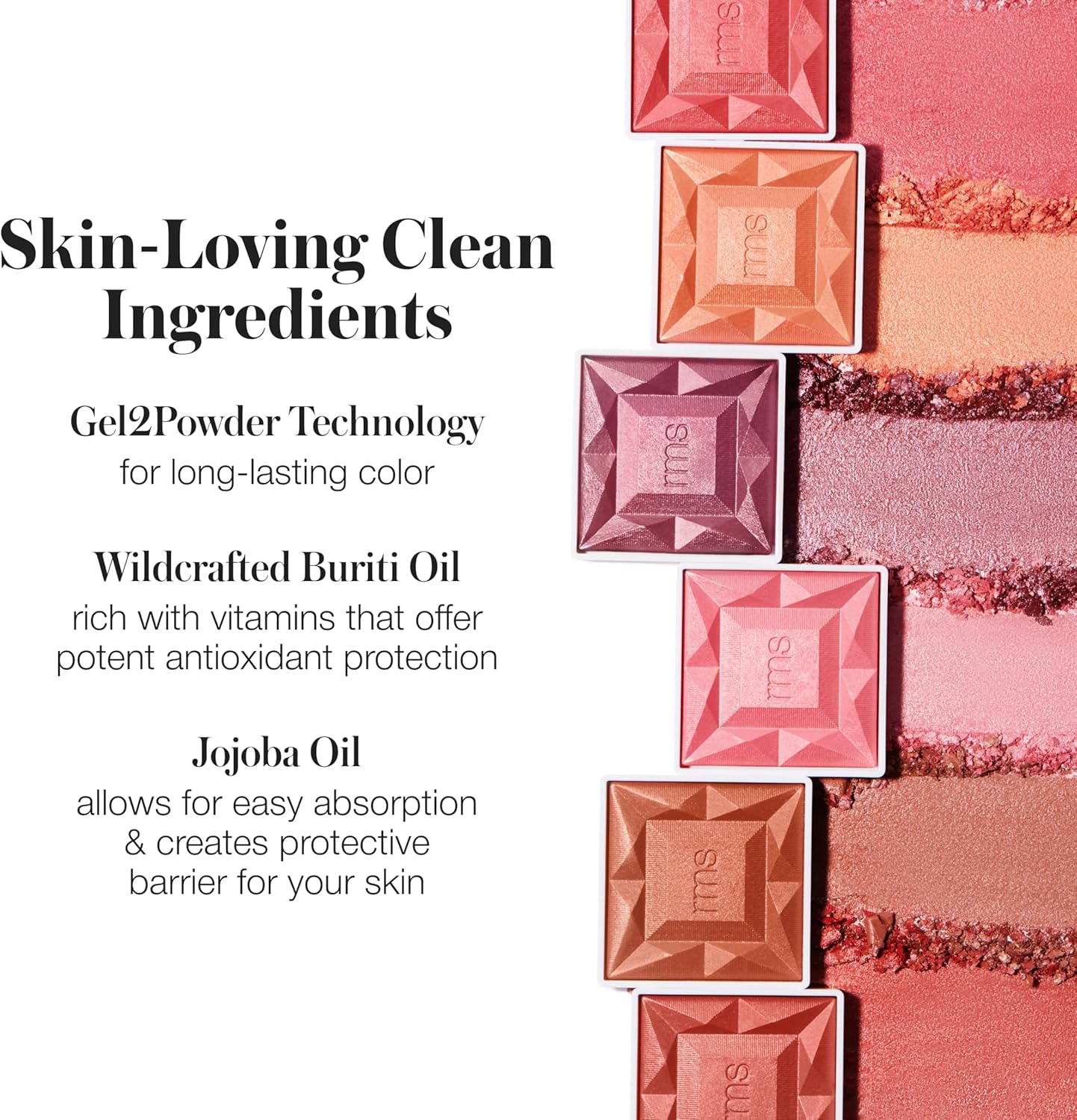 Multi-dimensional, nourishing powder blush. It glides on effortlessly, infusing skin with multi-dimensional life as the bouncy, light-as-air gel blends and builds color. The sugar-derived wet powder technology combines a creamy texture with a long-lasting 3D finish. Skin-loving ingredients like wildcrafted buriti and organic jojoba oils nourish and smooth. Mirrored compact is 75% PCR and refillable. Outer carton made of 80% post consumer recycled paper and vegetal ink.
