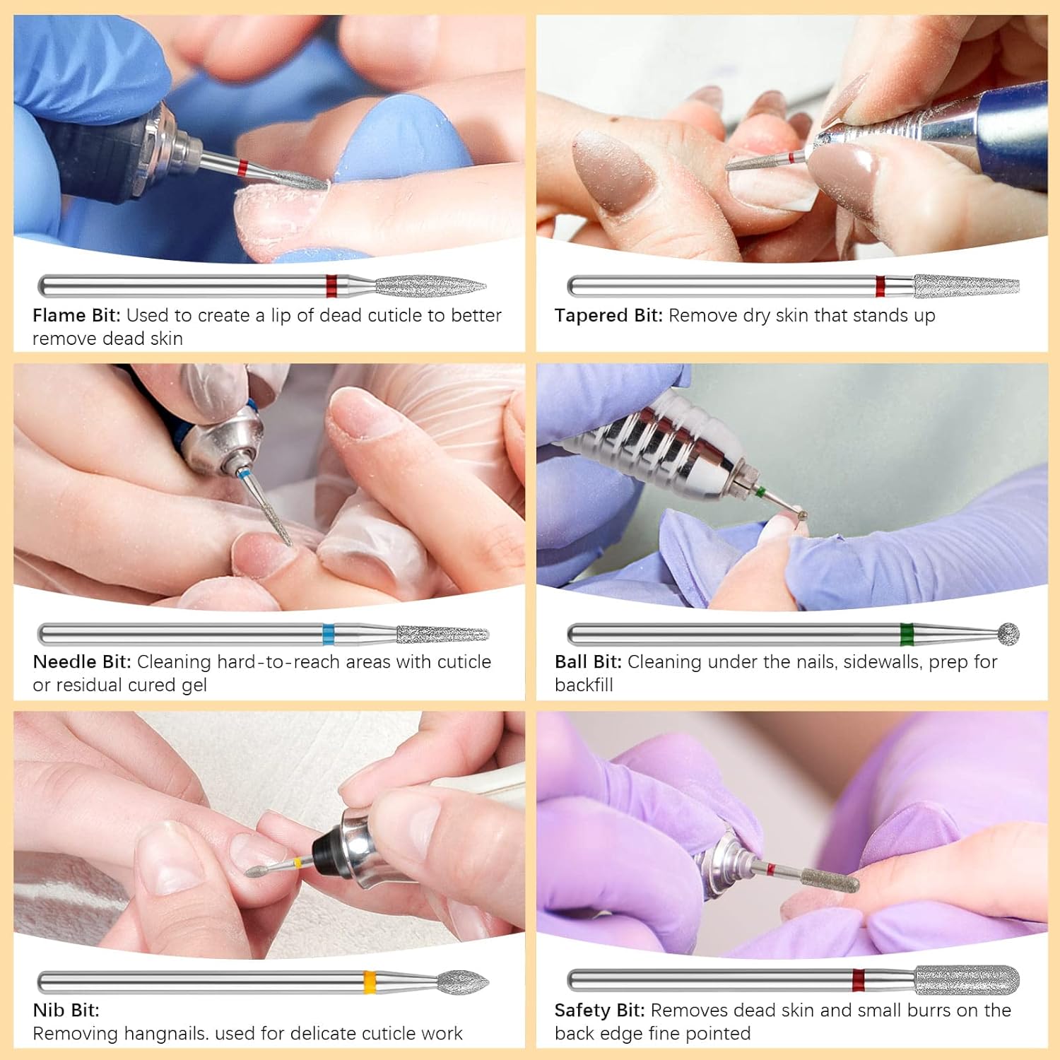 Cuticle Nail Drill Bit Set: This nail drill set provides all the necessary features, comes with 6 various shapes to suit different kinds of needs, from the cuticle area, sidewalls, dead skin and under the nail edge, to give your nails a luxurious finish, suitable for professional manicurists and beginners