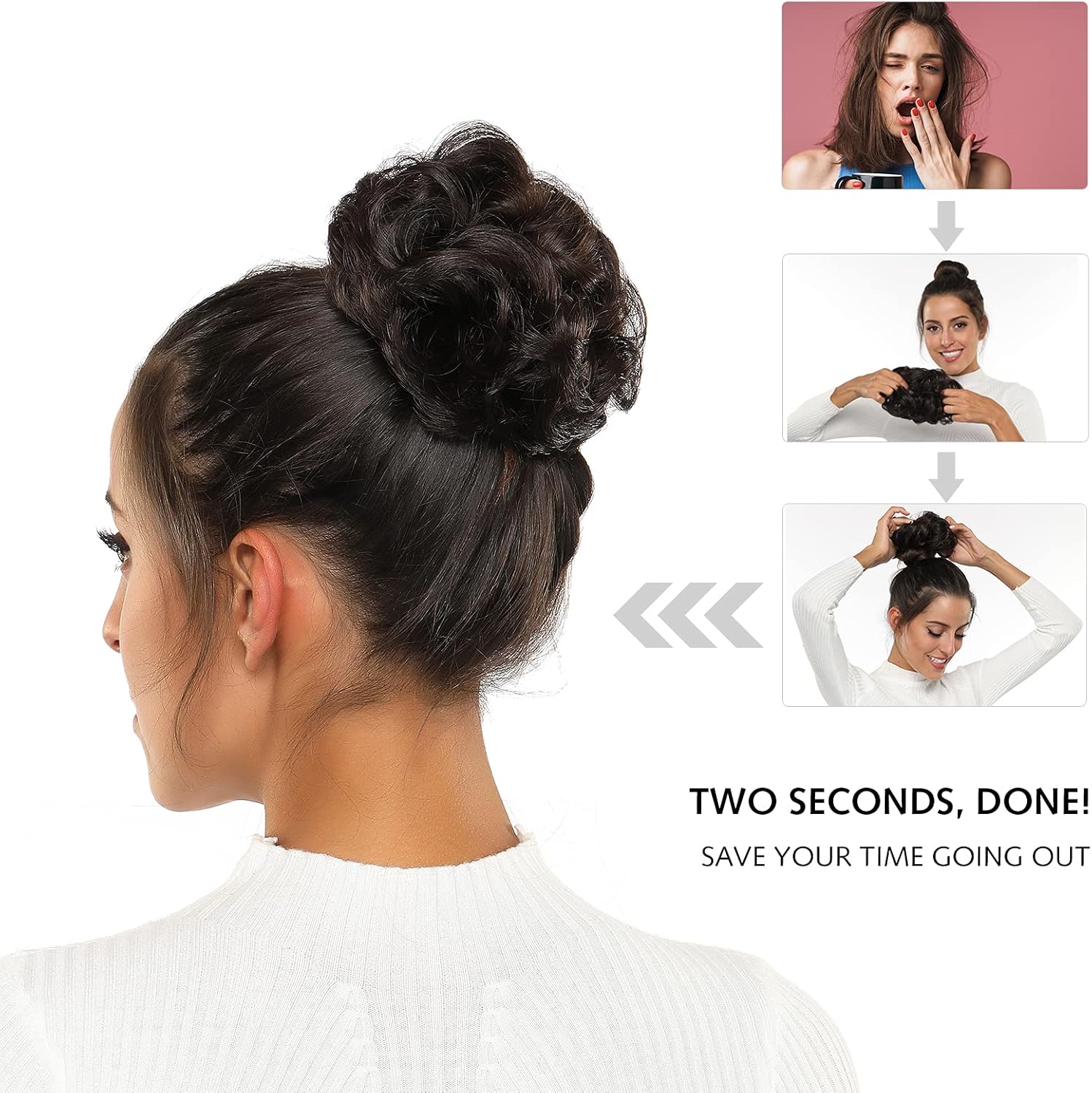 WASHABLE & EASY TO CARE ◆ Messy bun updos hair, heat-resisting synthetic fibers, allows you to wash with shampoo and make smell with perfume.Arrange it slightly after washing, allow it in a ventilated place to dry naturally, then use your fingers or comb to tidy. In order to ensure naturalness after washing, hair dryer is not recommended.