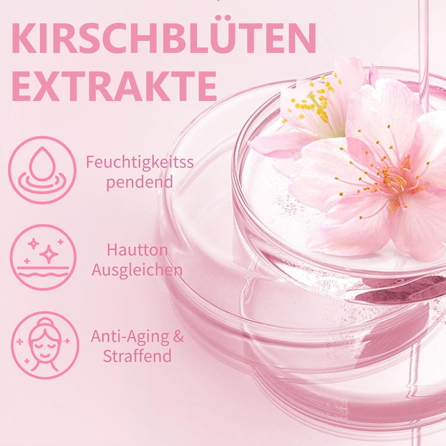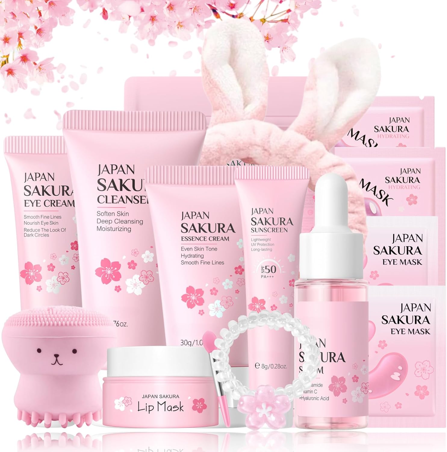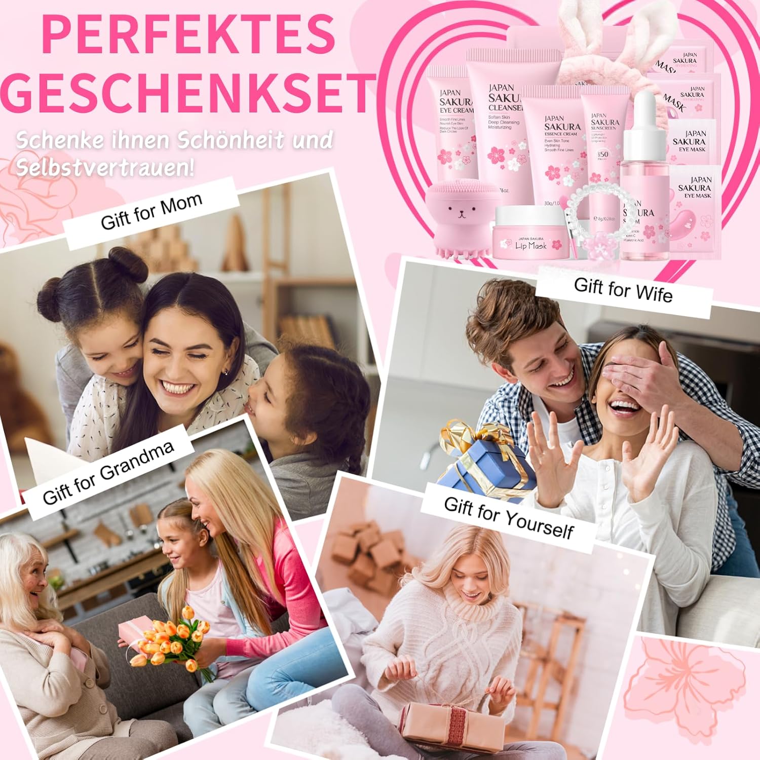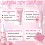 Full face care set: the face care beauty set girls contains a cleanser, a face serum, an eye cream, a face cream, sun protection, lip masks, eye masks, a headband, a facial cleansing brush and a hair tie. The sakura skincare set gifts for women is simple and effective – cleansing, moisturising and anti-ageing in just one step