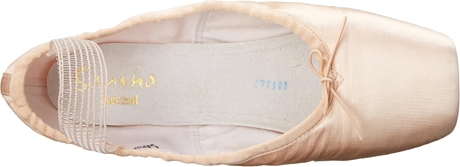 Sansha’s “Recital” has a unique “Pointe System” with a removable shank, a low crown, and large platform. Features “Whisper Toe” which deadens noise en pointe and when running on demi-pointe. Attached elastic. Ribbons not included.