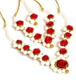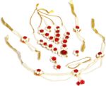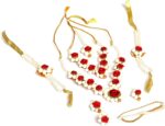 Material: Plastic Red rose and white colors jasmine flower Set contains a mangtika, 2 earrings, a hand bracelates, a long necklase, a choker, waist belt.
