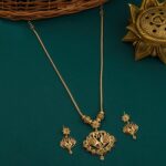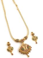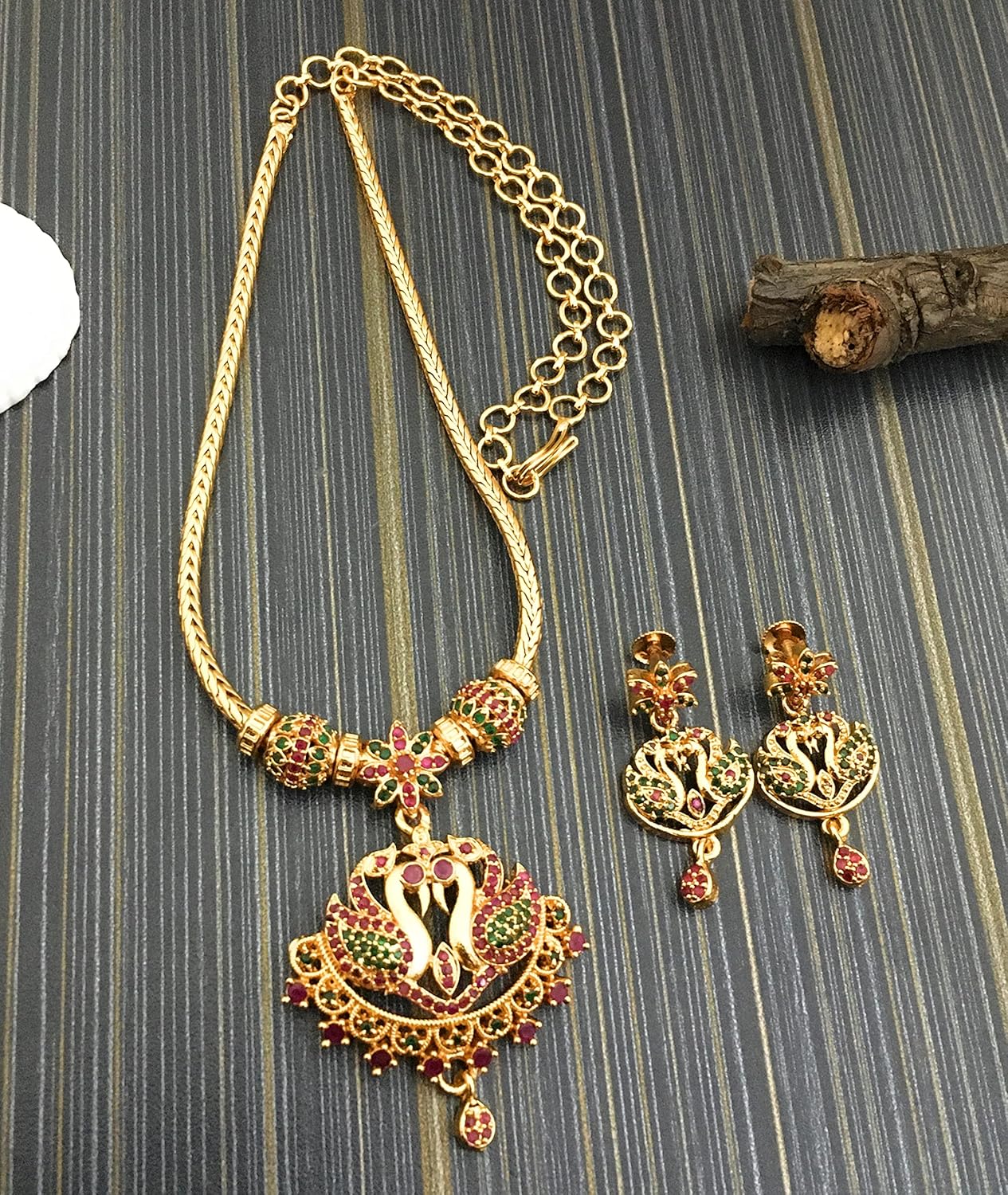 Elegance meets tradition in our latest one gram gold plated peacock jewellery set with matching earrings. The exquisite pendant features dual peacocks facing each other, adorned with sparkling American diamond stones and tear-drop shaped patterns. A floral motif connects the pendant to the flexible chain plated using 24-carat pure gold, which boasts round ball and chakra patterns on each side. Made from high-quality brass and plated with one gram of micro gold, this jewellery set exudes opulence with a touch of modernity. Perfect for traditional occasions, parties, birthdays, and festivals, it pairs beautifully with fancy sarees, traditional attire, or lehengas. An ideal gift for your loved ones. Sasitrends offers a wide variety of one gram gold plated jewellery, establishing itself as a pioneering and well-regarded online brand.
