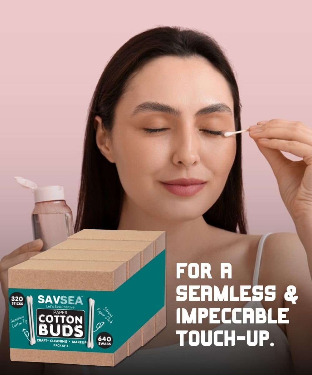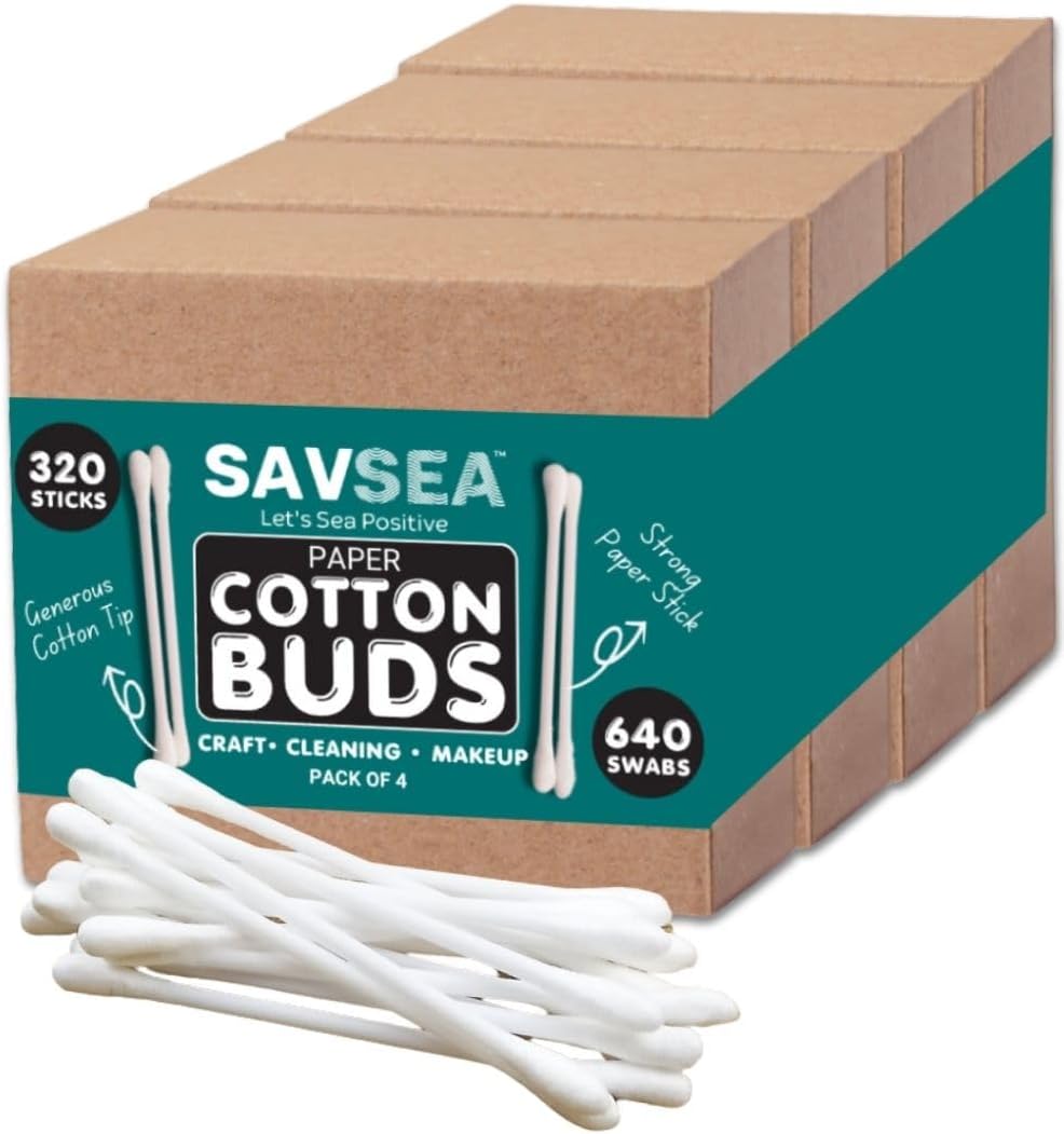 SAVSEA Paper Cotton Earbuds, Swabs, Q Tips, 320 Stems, 640 Swabs, Suitable For Adult And Baby, Multipurpose Double Tip Cotton Swabs With Sustainable Paper Better Than Wooden Stick (Pack Of 4)