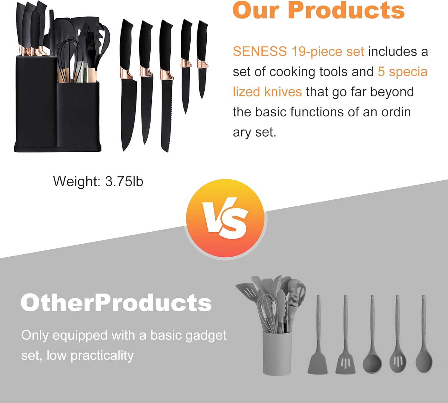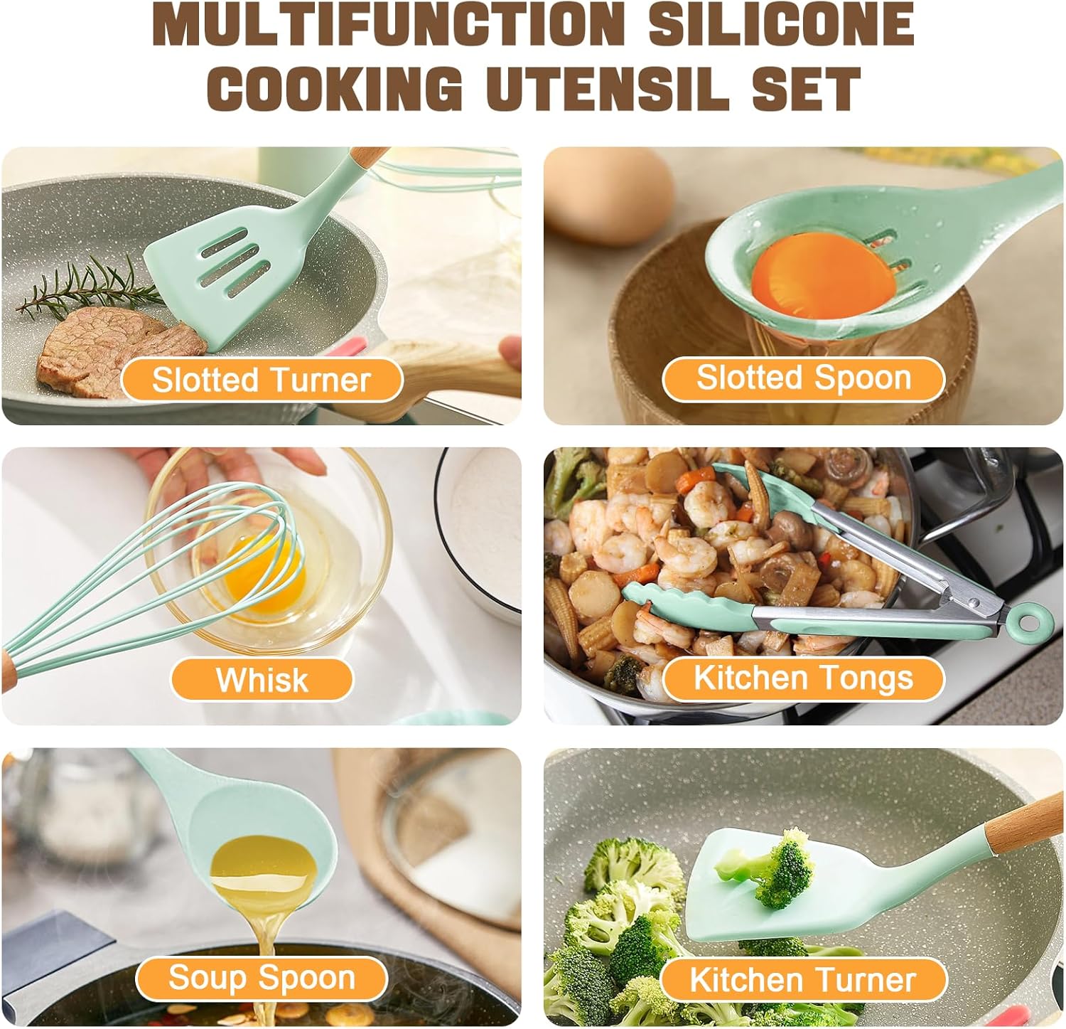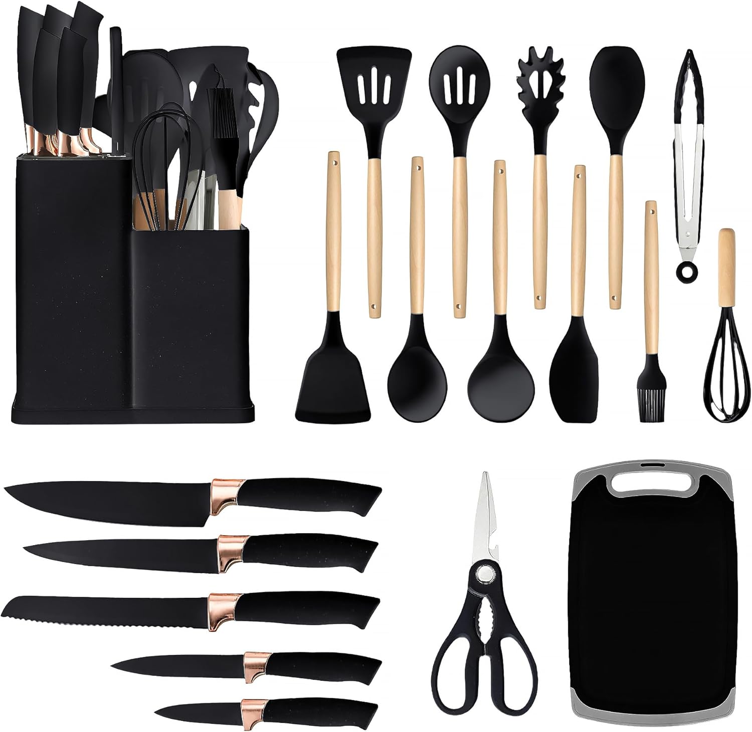 【Perfect Cookware Set】: Our silicone kitchen utensil set provides you with everything you need for cooking. This 19-piece cookware set includes a utensil holder, large slotted spatula, skimmer, solid spatula, slotted spatula, solid spoon, slotted spoon, soup spoon, pasta spoon, tongs and whisk. , spatula, soup spoon, skimmer, whisk and tongs as well as a set of special knives and more.