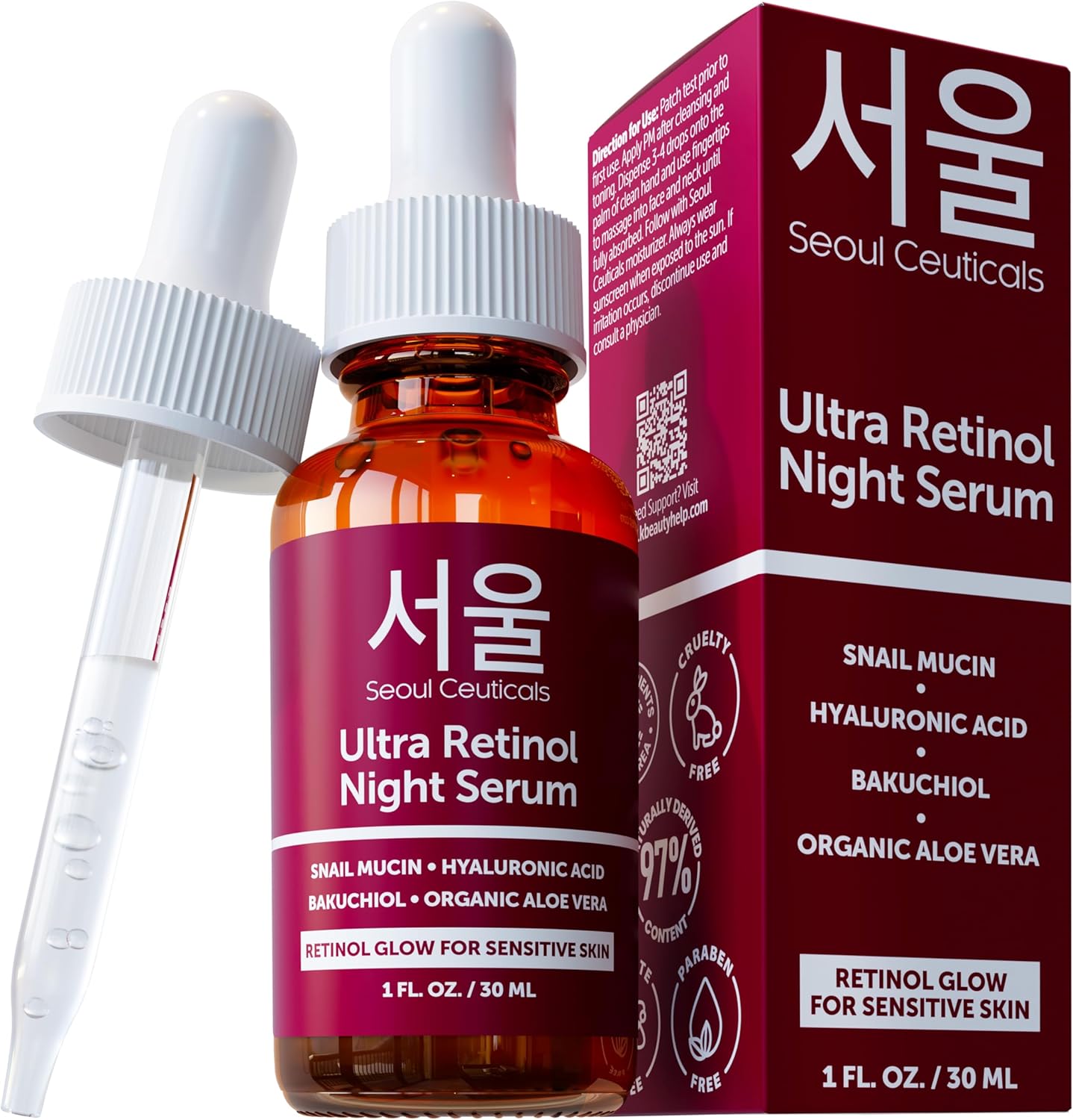 SeoulCeuticals 1% Korean Retinol Night Serum for Face – 97.5% Snail Mucin + Hyaluronic Acid + Bakuchiol, Cruelty Free K Beauty for Sensitive Skin 1oz