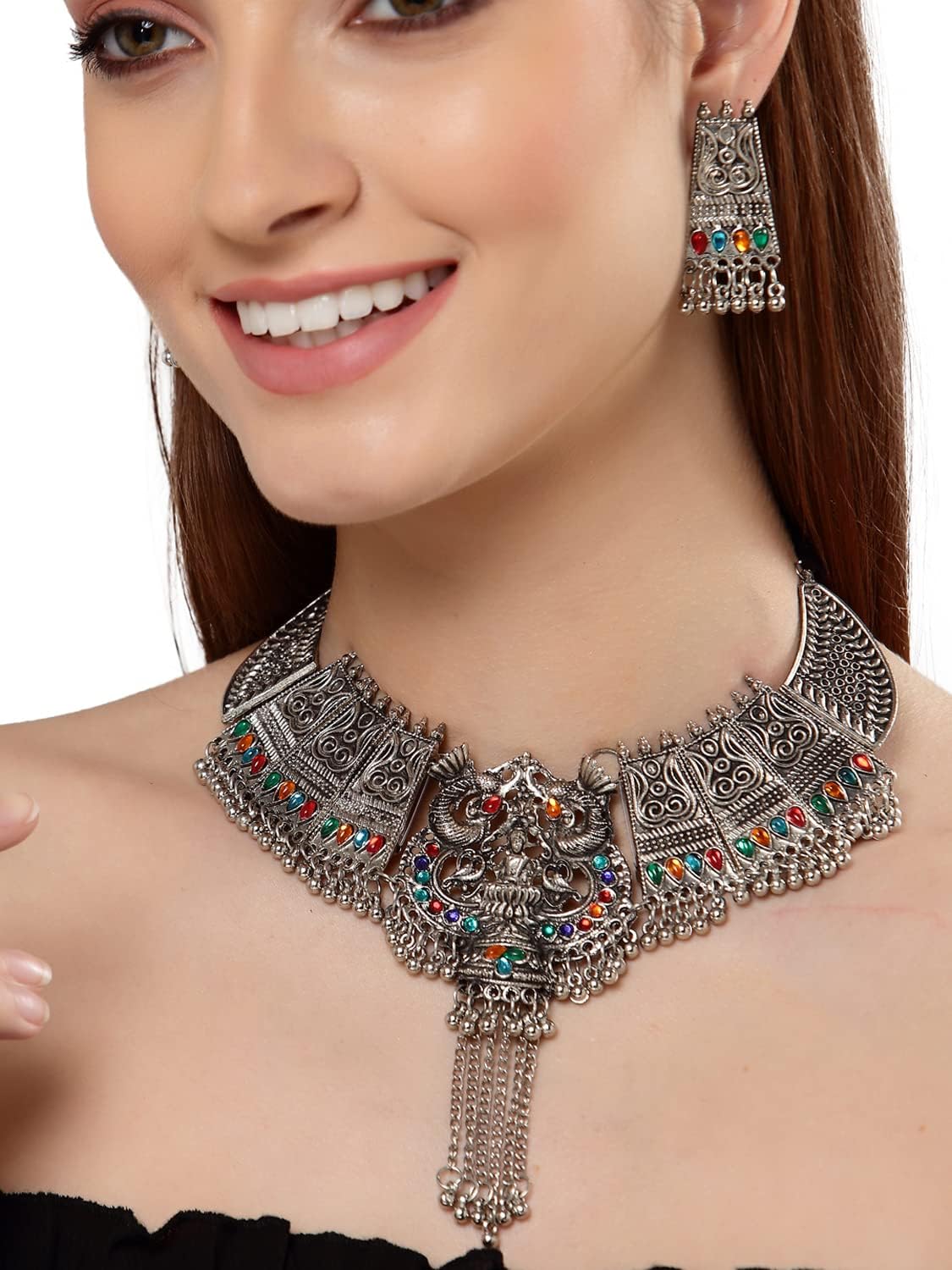 Shining diva presents this latest oxidized silver jewellery set stylish necklace set for women. This casual or wedding party wear oxidised necklace set for women is made of fine quality material which looks stylish and goes perfect with any attire. This traditional tribal Afghani Boho choker necklace set for women is perfectly suited for wedding or party wear. Shining diva is a well known brand across fashion jewellery sector. shining diva has huge collection of latest statement haram necklace jewellery, traditional necklace set, south indian type Lakshmi temple pendant set and other jewellery accessories which includes fancy bangles for women, wedding bangles, ear cuffs, traditional bangles kada, neck choker, fashion party wear necklace for girls and jhumki jhumka earrings. shining diva is pioneer of imitation jewellery and design pearl necklace set for women and american diamond hangings party wear stylish earrings. shining diva fashion and traditional jewellery give true value for your money. buy shining diva trendy artificial jewellery from amazon in offer. these are also ideal for special birthday gifts for girls, wife, love valentine gifts for girlfriend, wedding gifts and anniversary gifts.
