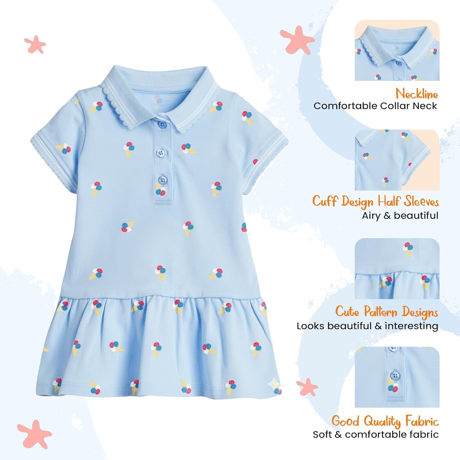 Made from 100% pure cotton, this dress is skin-friendly and breathable, ensuring your baby’s comfort. With its cute design and vibrant colors, it’s not just a dress—it’s a statement piece!