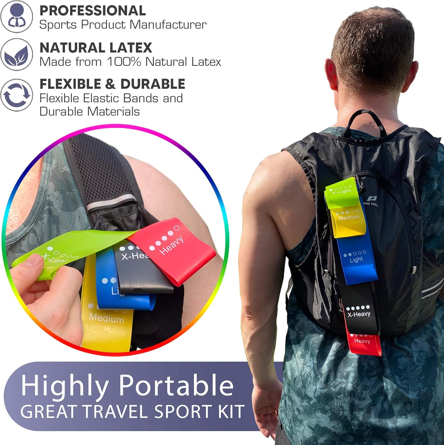 These rubber bands are rigorously tested to be snap. You get 5 fitness band for gym in different resistance strength levels from low to high: X-Light (2-4Kg), Light (4-6Kg), Medium (6-9Kg), Heavy (10-13Kg) and X-Heavy (13-18Kg). The exercise loop band fitness can be used alone stacked in any combination to a maximum equivalent of 35-45 Kg. Take your elastic bands for workout everywhere, they are so lightweight that they make a great travel elastic exercise equipment!