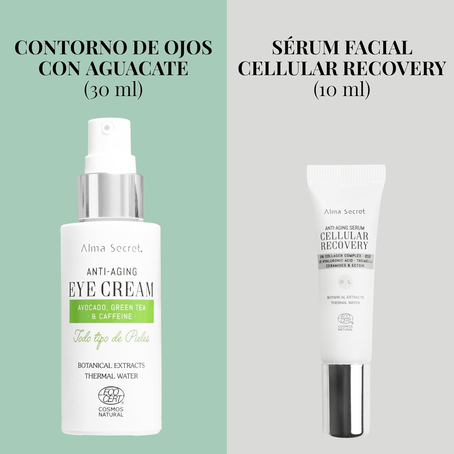 Discover the transformative power of our Premium Facial Care Pack, which includes the hydrating eye contour of Avocado, Green Tea and Caffeine along with the Cellular Recovery women’s facial serum. Designed to work in synergy, these skin care products not only combat visible signs of aging but also offer deep nutrition and protection against free radicals thanks to their rich botanical ingredients and advanced beauty product technologies. The anti-bag eye contour is specially formulated to reduce puffiness, attenuate dark circles and treat fine lines, thanks to its combination of caffeine, green tea extracts and organic oils. The natural facial serum, meanwhile, uses an innovative complex of vegan collagen peptides and coenzyme Q10 to strengthen the skin barrier and rejuvenate the skin from the inside. Both Cellular Recovery Collagen Serum and Anti-Wrinkle Eye Contour are products formulated with natural ingredients, ensuring a pure and effective facial care experience. Ideal for all skin types and especially beneficial for those with sensitive or mature skin. Include these beauty essentials in your daily routine to experience firmer, hydrated and luminous skin.