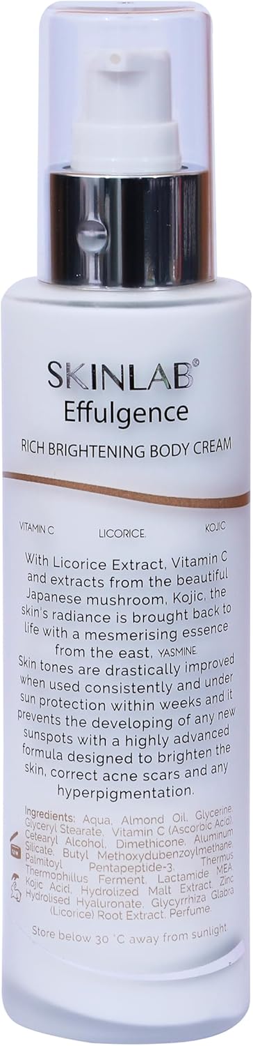 Features of SKINLAB Effulgence Rich Body Whitening Cream| For all Skintype| Vitamin C| Kojic Enriched| 120ml: Double-Duty Brightening: Licorice Extract, Vitamin C, and Kojic Acid combine to lighten and brighten your skin tone, revealing a luminous complexion.
