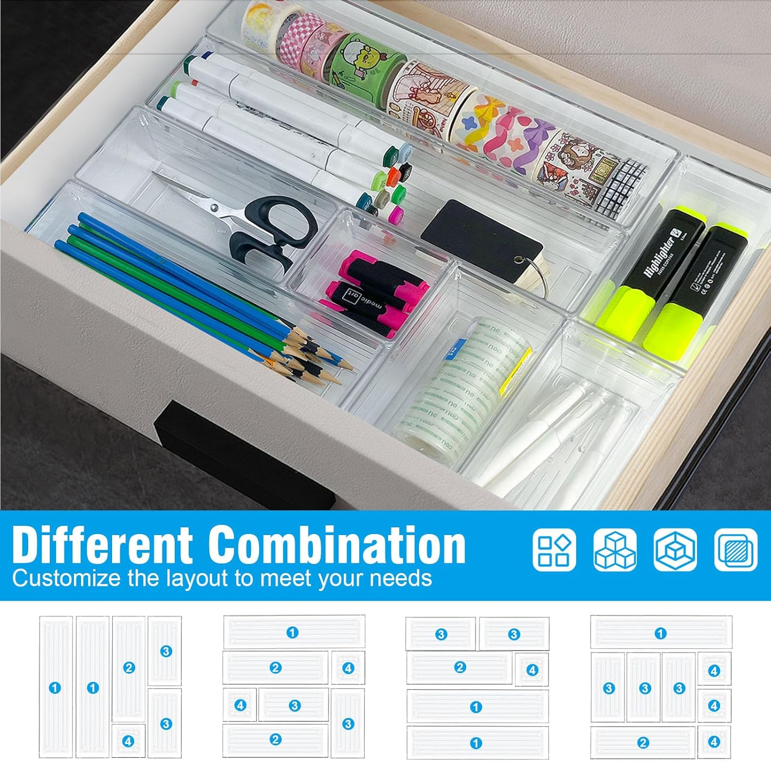 SKY-TOUCH Clear Plastic Drawer Organizer,Drawer Organizer Trays,Desk Drawer Organizer Trays,4 Size Large Storage Organizer Divider Set for Fridge Organizer, Bathroom, Vanity Storage Bins,Office