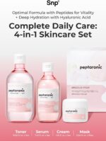 Peptaronic Toner: This high-nutrition toner with liquid-textured hyaluronic acids heals and repairs skin while balancing oil and moisture, creating a healthy complexion. Peptaronic Serum: Achieve impeccable skin with this serum, offering a flawless, powdery finish. It moisturizes and refines skin texture using a non-oily silk moisture system. Peptaronic Cream: With 5 layers of hyaluronic acid, this cream deeply replenishes moisture, prevents surface moisture loss, and forms a protective barrier to keep skin hydrated and healthy. Peptaronic Ampoule Mask: The SNP PREP Ampoule Mask combines peptides and hyaluronic acid to supplement skin vitality and deeply moisturize. With 6 types of peptides and a moisture barrier, it protects skin from irritation and external stressors. Total Care with 6 Peptide Complex: This cream offers total care from head to toe, absorbing quickly to address rough and dry skin. It forms a moisture barrier for flawless skin and revitalizes with 6 types of peptides, restoring the skin’s natural glow. korean skin care set, skin care kit, glass skin korean skincare set, skin care sets & kits, skincare kits,, korean skin care kit for women, face care kit, beauty gift sets, skincare sets, facial set, beauty kit, beauty set, skincare gift set, korean glass skin set, skin care pack, korean skin care sets for women, mini skincare set, face skin care set