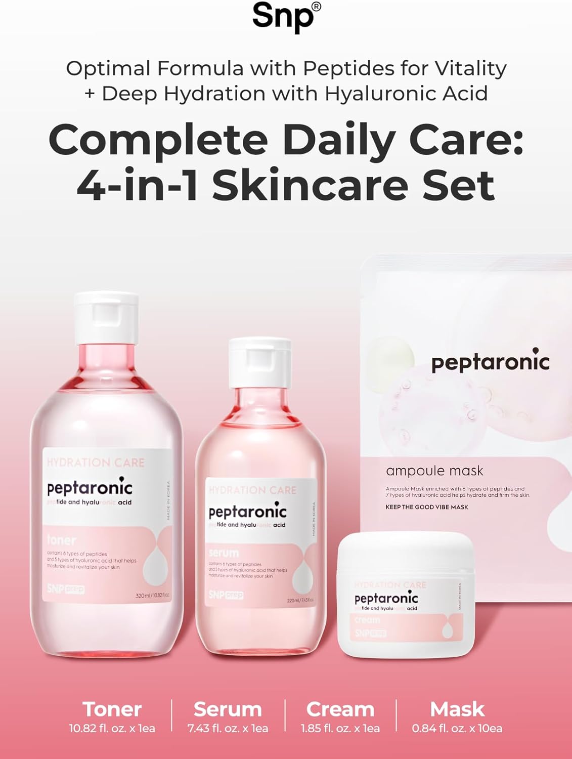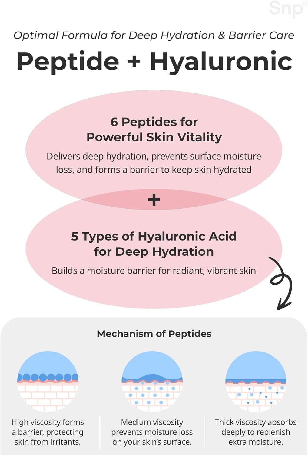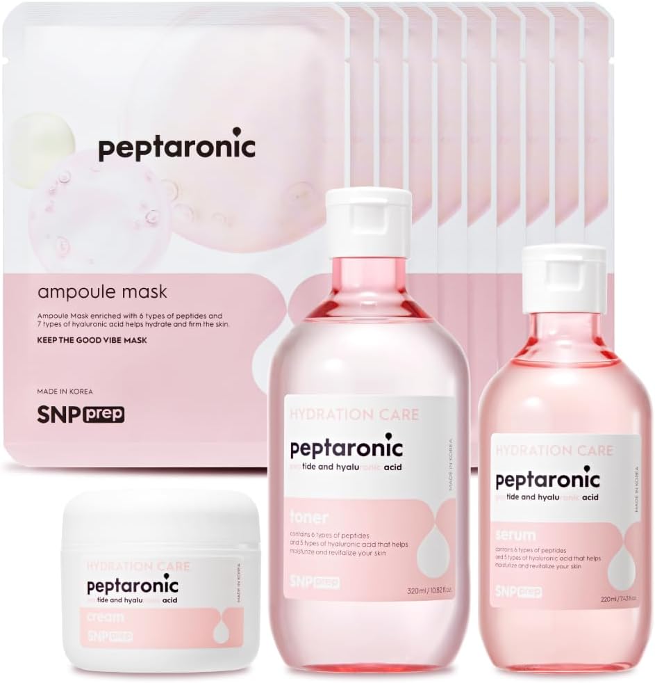 Peptaronic Toner: This high-nutrition toner with liquid-textured hyaluronic acids heals and repairs skin while balancing oil and moisture, creating a healthy complexion. Peptaronic Serum: Achieve impeccable skin with this serum, offering a flawless, powdery finish. It moisturizes and refines skin texture using a non-oily silk moisture system. Peptaronic Cream: With 5 layers of hyaluronic acid, this cream deeply replenishes moisture, prevents surface moisture loss, and forms a protective barrier to keep skin hydrated and healthy. Peptaronic Ampoule Mask: The SNP PREP Ampoule Mask combines peptides and hyaluronic acid to supplement skin vitality and deeply moisturize. With 6 types of peptides and a moisture barrier, it protects skin from irritation and external stressors. Total Care with 6 Peptide Complex: This cream offers total care from head to toe, absorbing quickly to address rough and dry skin. It forms a moisture barrier for flawless skin and revitalizes with 6 types of peptides, restoring the skin’s natural glow. korean skin care set, skin care kit, glass skin korean skincare set, skin care sets & kits, skincare kits,, korean skin care kit for women, face care kit, beauty gift sets, skincare sets, facial set, beauty kit, beauty set, skincare gift set, korean glass skin set, skin care pack, korean skin care sets for women, mini skincare set, face skin care set