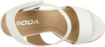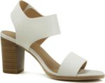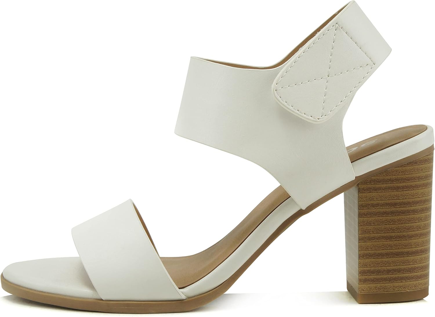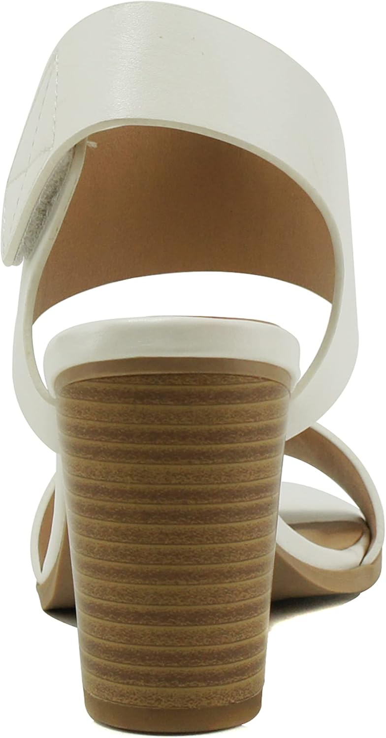 Dress sandal featuring open toe strap with adjustable ankle strap and a stacked wood look block heel. Quality faux leather design. Great comfort and style.