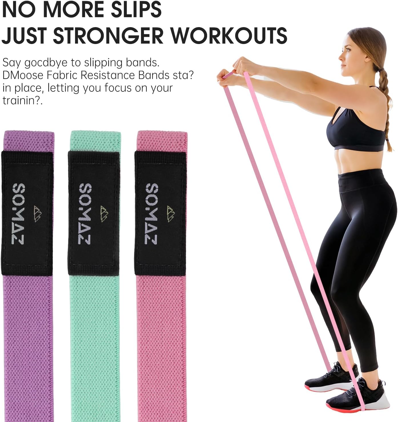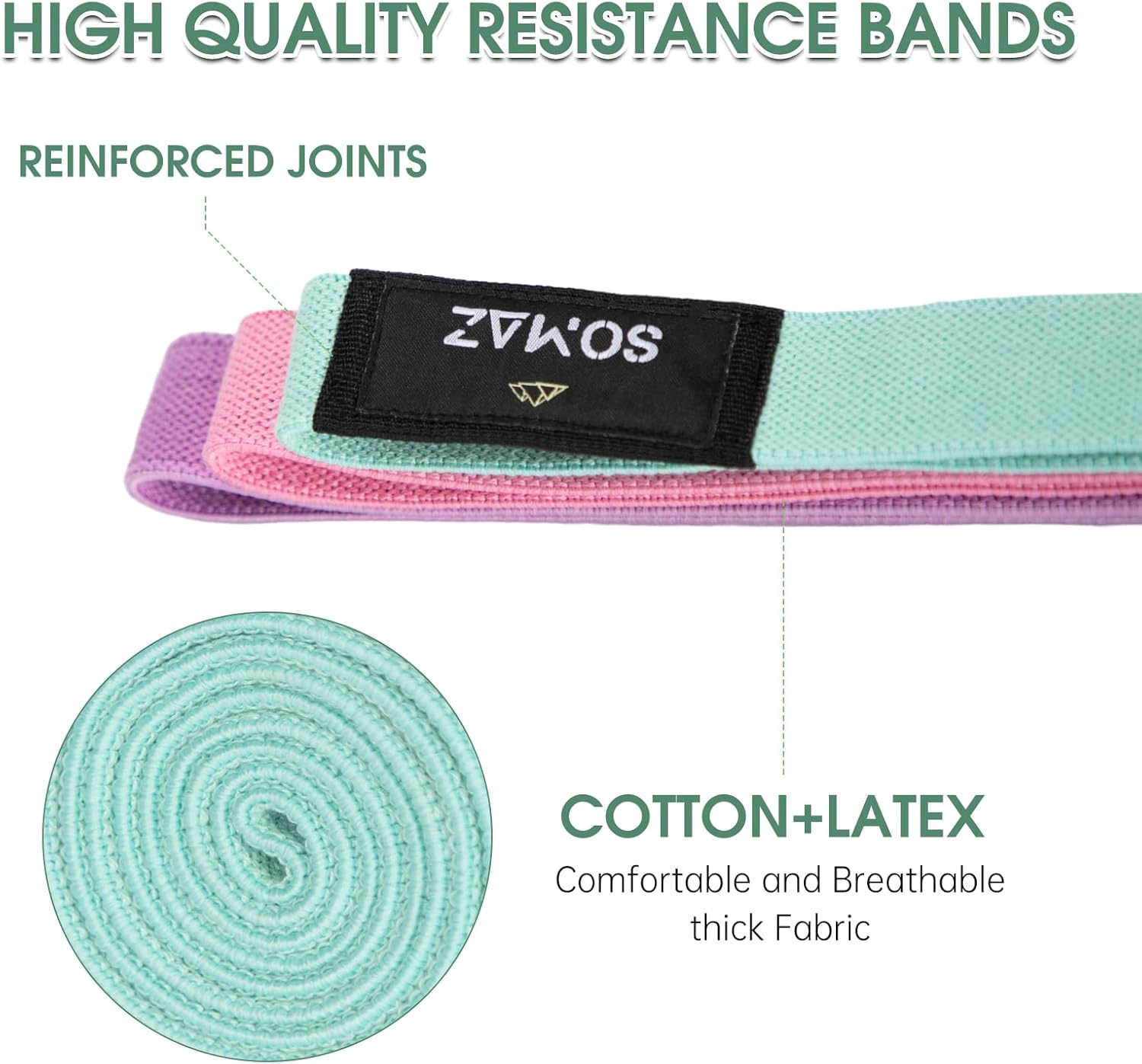 SOMAZ Fabric Resistance Bands Elevate your workout with SOMAZ’s premium fabric resistance bands. Designed for durability and comfort, these non-slip bands come in three resistance levels—mint green (light), pink (medium), and purple (heavy). Ideal for home workouts, yoga, pilates, and strength training. Perfect for toning legs, glutes, and core with ease and style.