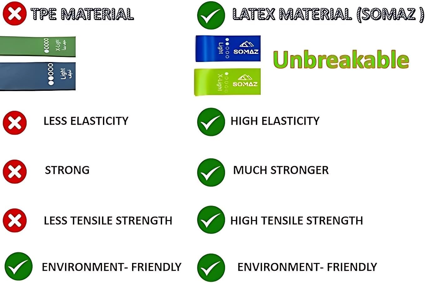 💥 : Highly versatile SOMAZ resistance bands can be used for just about any compound lifts, isolation exercises, isometrics, plyometrics, stretches, injury recovery, etc. ♻ : Premium quality latex resistance bands can easily withstand deterrents such as water, pressure, and extensive use. These bands are environmentally friendly thus providing full safety for disposal.